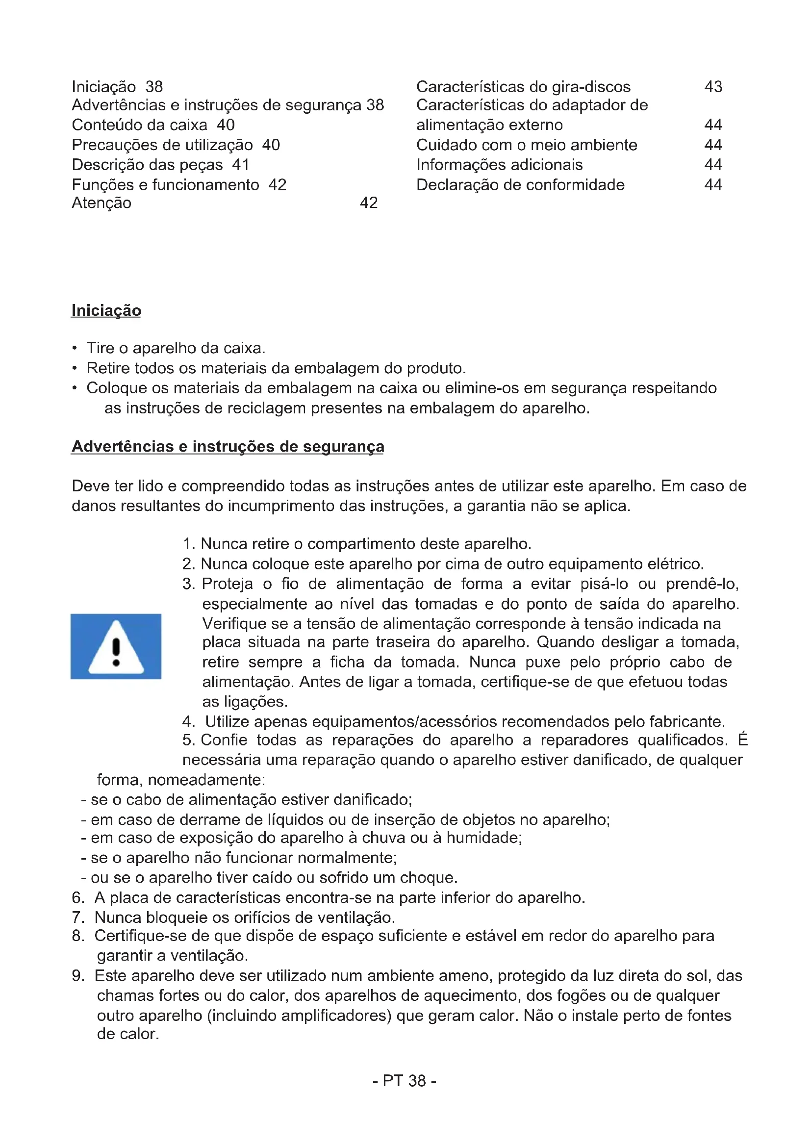 chamas fortes ou do calor, dos aparelhos de aquecimento, dos fogões ou de qualquer outro aparelho (incluindo amplicadores) que geram calor. Não o inale perto de fontes de calor. Iniciação 38 Advertências e inruções de segurança 38 Conteúdo da caixa 40 Precauções de utilização 40 Descrição das peças 41 Funções e funcionamento 42 Atenção 42 Caracteríicas do gira-discos 43 Caracteríicas do adaptador de alimentação externo 44 Cuidado com o meio ambiente 44 Informações adicionais 44 Declaração de conformidade 44- PT 39 -