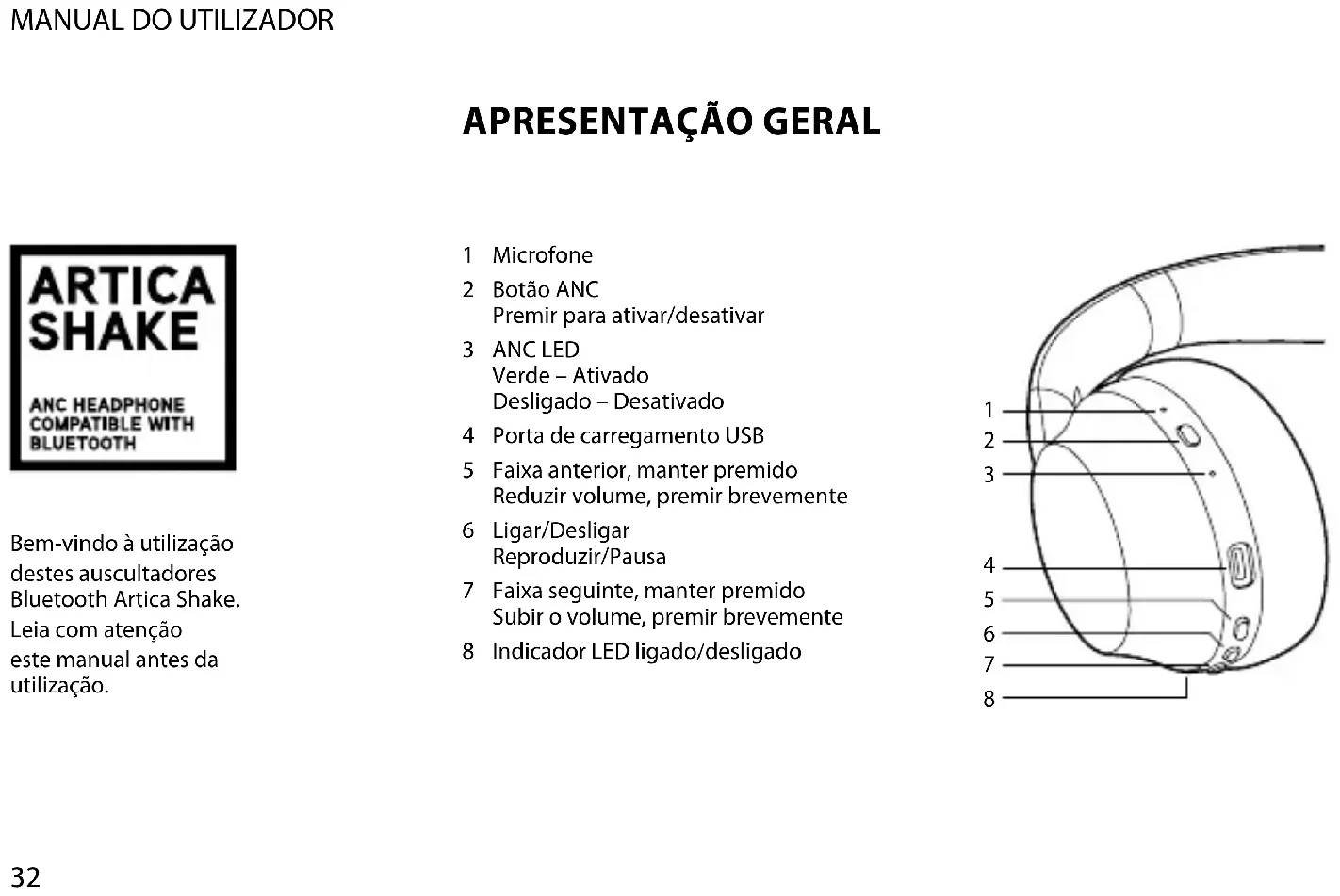 Bem-vindo à utilização destes auscultadores Bluetooth Artica Shake. Leia com atenção este manual antes da utilização.