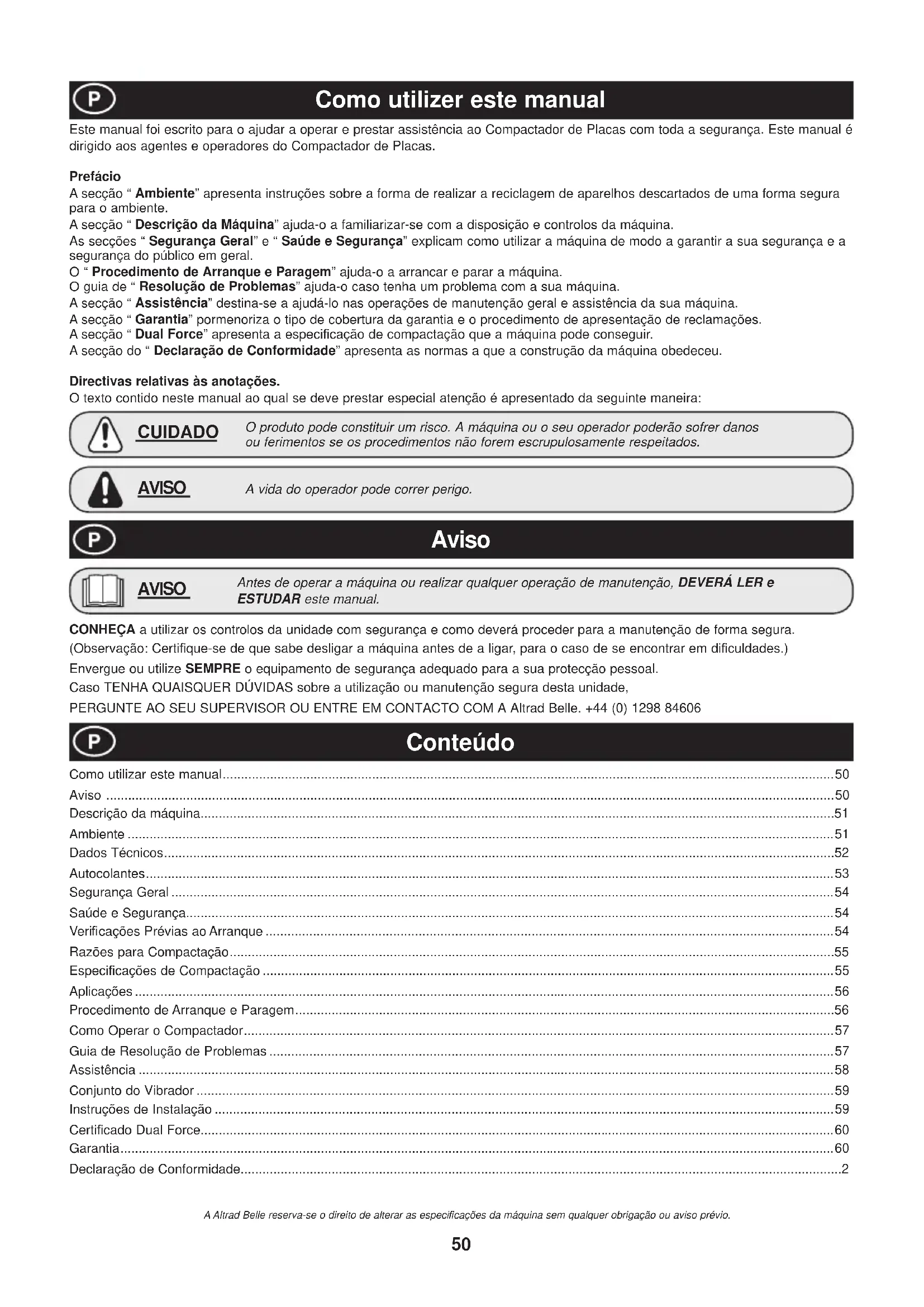 - Bujía del motor Altrad Belle y/o sus agentes reconocidos, directores, empleados o aseguradores no se responsabilizan de ningún daño consecuencial u otros, pérdidas o gastos relacionados con o debidos a la inhabilidad de usar la máquina. Reclamaciones contra la garantía Todas las reclamaciones presentadas al amparo de la garantía deben dirigirse primero a Altrad Belle ya sea por teléfono, fax, correo electrónico o por escrito. Para las reclamaciones contra la garantía : Tel: +44(0)1298 84606 Fax: +44 (0)1298 84722 Email : Warranty@belle-group.co.uk Escriban a : Sheen, Nr. Buxton Derbyshire SK17 0EU England. E50 CONHEÇA a utilizar os controlos da unidade com segurança e como deverá proceder para a manutenção de forma segura. (Observação: Certi¿ que-se de que sabe desligar a máquina antes de a ligar, para o caso de se encontrar em di¿ culdades.) Envergue ou utilize SEMPRE o equipamento de segurança adequado para a sua protecção pessoal. Caso TENHA QUAISQUER DÚVIDAS sobre a utilização ou manutenção segura desta unidade, PERGUNTE AO SEU SUPERVISOR OU ENTRE EM CONTACTO COM A Altrad Belle. +44 (0) 1298 84606 Aviso Antes de operar a máquina ou realizar qualquer operação de manutenção, DEVERÁ LER e ESTUDAR este manual. AVISO Conteúdo A Altrad Belle reserva-se o direito de alterar as especi¿ cações da máquina sem qualquer obrigação ou aviso prévio. Como utilizar este manual ........................................................................................................................................................................50 Aviso ........................................................................................................................................................................................................50 Descrição da máquina..............................................................................................................................................................................51 Ambiente ..................................................................................................................................................................................................51 Dados Técnicos ........................................................................................................................................................................................52 Autocolantes .............................................................................................................................................................................................53 Segurança Geral ......................................................................................................................................................................................54 Saúde e Segurança..................................................................................................................................................................................54 Veri¿ cações Prévias ao Arranque ............................................................................................................................................................54 Razões para Compactação ......................................................................................................................................................................55 Especi¿ cações de Compactação .............................................................................................................................................................55 Aplicações ................................................................................................................................................................................................56 Procedimento de Arranque e Paragem ....................................................................................................................................................56 Como Operar o Compactador ..................................................................................................................................................................57 Guia de Resolução de Problemas ...........................................................................................................................................................57 Assistência ...............................................................................................................................................................................................58 Conjunto do Vibrador ...............................................................................................................................................................................59 Instruções de Instalação ..........................................................................................................................................................................59 Certi¿ cado Dual Force..............................................................................................................................................................................60 Garantia ....................................................................................................................................................................................................60 Declaração de Conformidade.....................................................................................................................................................................2 Como utilizer este manual Este manual foi escrito para o ajudar a operar e prestar assistência ao Compactador de Placas com toda a segurança. Este manual é dirigido aos agentes e operadores do Compactador de Placas. Prefácio A secção “ Ambiente” apresenta instruções sobre a forma de realizar a reciclagem de aparelhos descartados de uma forma segura para o ambiente. A secção “ Desc