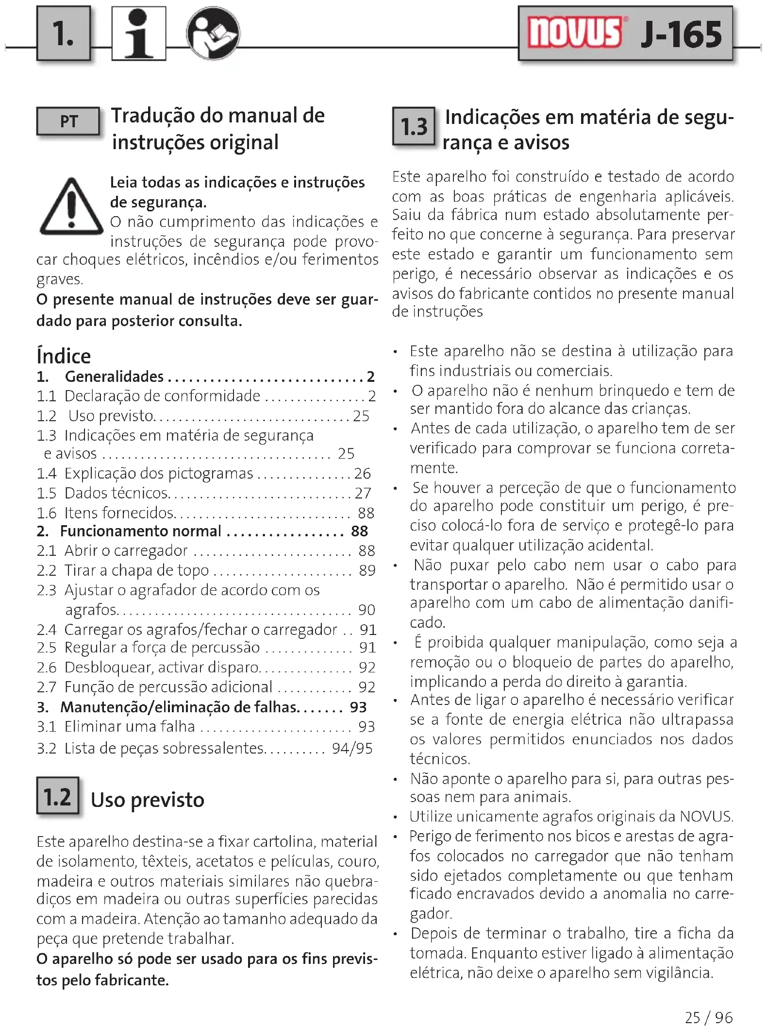 Indicações em matéria de segu- rança e avisos Este aparelho foi construído e testado de acordo com as boas práticas de engenharia aplicáveis. Saiu da fábrica num estado absolutamente per-feito no que concerne à segurança. Para preservar este estado e garantir um funcionamento sem perigo, é necessário observar as indicações e os avisos do fabricante contidos no presente manual de instruções• Este aparelho não se destina à utilização para fins industriais ou comerciais.• O aparelho não é nenhum brinquedo e tem de ser mantido fora do alcance das crianças.• Antes de cada utilização, o aparelho tem de ser verificado para comprovar se funciona correta-mente. • Se houver a perceção de que o funcionamento do aparelho pode constituir um perigo, é pre-ciso colocá-lo fora de serviço e protegê-lo para evitar qualquer utilização acidental.• Não puxar pelo cabo nem usar o cabo para transportar o aparelho. Não é permitido usar o aparelho com um cabo de alimentação danifi-cado.• É proibida qualquer manipulação, como seja a remoção ou o bloqueio de partes do aparelho, implicando a perda do direito à garantia.• Antes de ligar o aparelho é necessário verificar se a fonte de energia elétrica não ultrapassa os valores permitidos enunciados nos dados técnicos.• Não aponte o aparelho para si, para outras pes-soas nem para animais.• Utilize unicamente agrafos originais da NOVUS. • Perigo de ferimento nos bicos e arestas de agra-fos colocados no carregador que não tenham sido ejetados completamente ou que tenham ficado encravados devido a anomalia no carre-gador.• Depois de terminar o trabalho, tire a ficha da tomada. Enquanto estiver ligado à alimentação elétrica, não deixe o aparelho sem vigilância. /