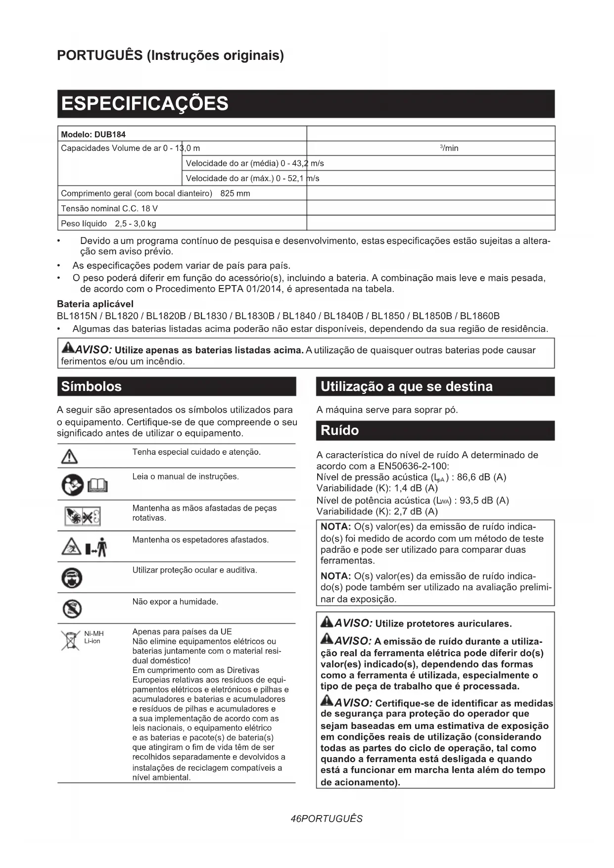 - Algumasdasbateriaslistadasacimapoderãonãoestardisponíveis,dependendodasuaregiãoderesidência. AVISO: Utilize apenas as baterias listadas acima.Autilizaçãodequaisqueroutrasbateriaspodecausar ferimentos e/ou um incêndio. Símbolos Aseguirsãoapresentadosossímbolosutilizadospara oequipamento.Certique-sedequecompreendeoseu signicadoantesdeutilizaroequipamento. Tenha especial cuidado e atenção. Leiaomanualdeinstruções. Mantenha as mãos afastadas de peças rotativas. Mantenha os espetadores afastados. Utilizar proteção ocular e auditiva. Não expor a humidade. Ni-MH Li-ion ApenasparapaísesdaUE Nãoelimineequipamentoselétricosou bateriasjuntamentecomomaterialresi- dual doméstico! EmcumprimentocomasDiretivas Europeiasrelativasaosresíduosdeequi- pamentos elétricos e eletrónicos e pilhas e acumuladoresebateriaseacumuladores eresíduosdepilhaseacumuladorese a sua implementação de acordo com as leisnacionais,oequipamentoelétrico easbateriasepacote(s)debateria(s) queatingiramomdevidatêmdeser recolhidos separadamente e devolvidos a instalaçõesdereciclagemcompatíveisa nívelambiental. Utilização a que se destina Amáquinaserveparasoprarpó. Ruído AcaracterísticadonívelderuídoAdeterminadode acordocomaEN50636-2-100: Níveldepressãoacústica(L