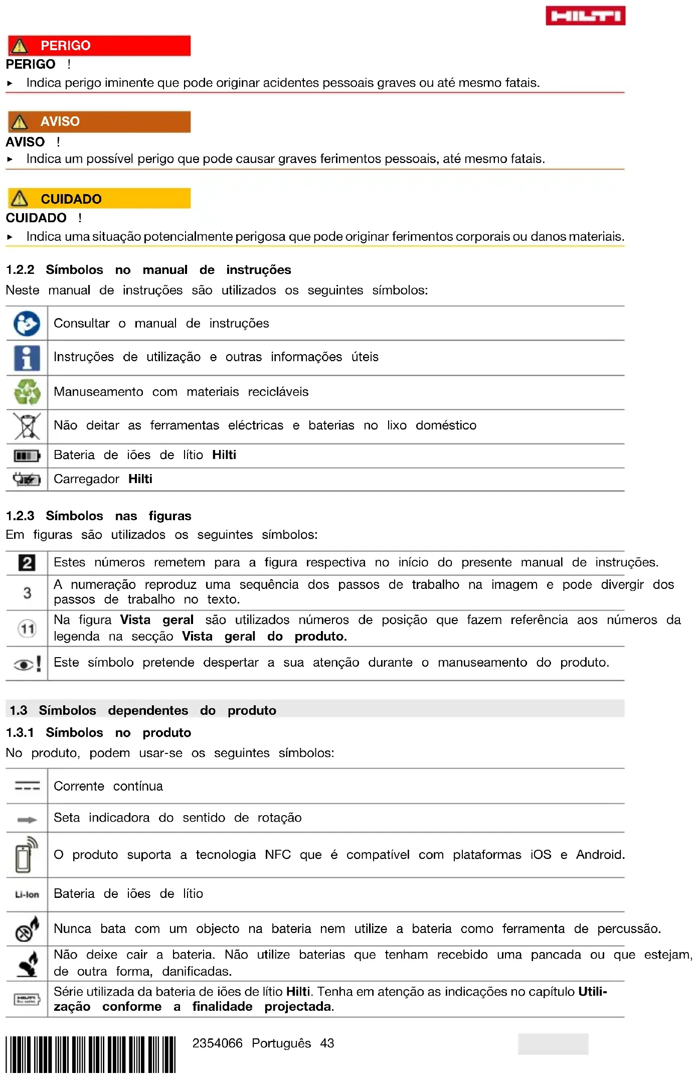 No produto, podem usar-se os seguintes símbolos: Corrente contínua Seta indicadora do sentido de rotação O produto suporta a tecnologia NFC que é compatível com plataformas iOS e Android. Bateria de iões de lítio Nunca bata com um objecto na bateria nem utilize a bateria como ferramenta de percussão. Não deixe cair a bateria. Não utilize baterias que tenham recebido uma pancada ou que estejam, de outra forma, danificadas. Série utilizada da bateria de iões de lítio Hilti. Tenha em atenção as indicações no capítulo Utili- zação conforme a finalidade projectada.44 Português 2354066 *2354066* Se existente no produto, isso significa que o produto foi certificado por este organismo de certifi- cação para o mercado americano e canadiano de acordo com as normas em vigor.