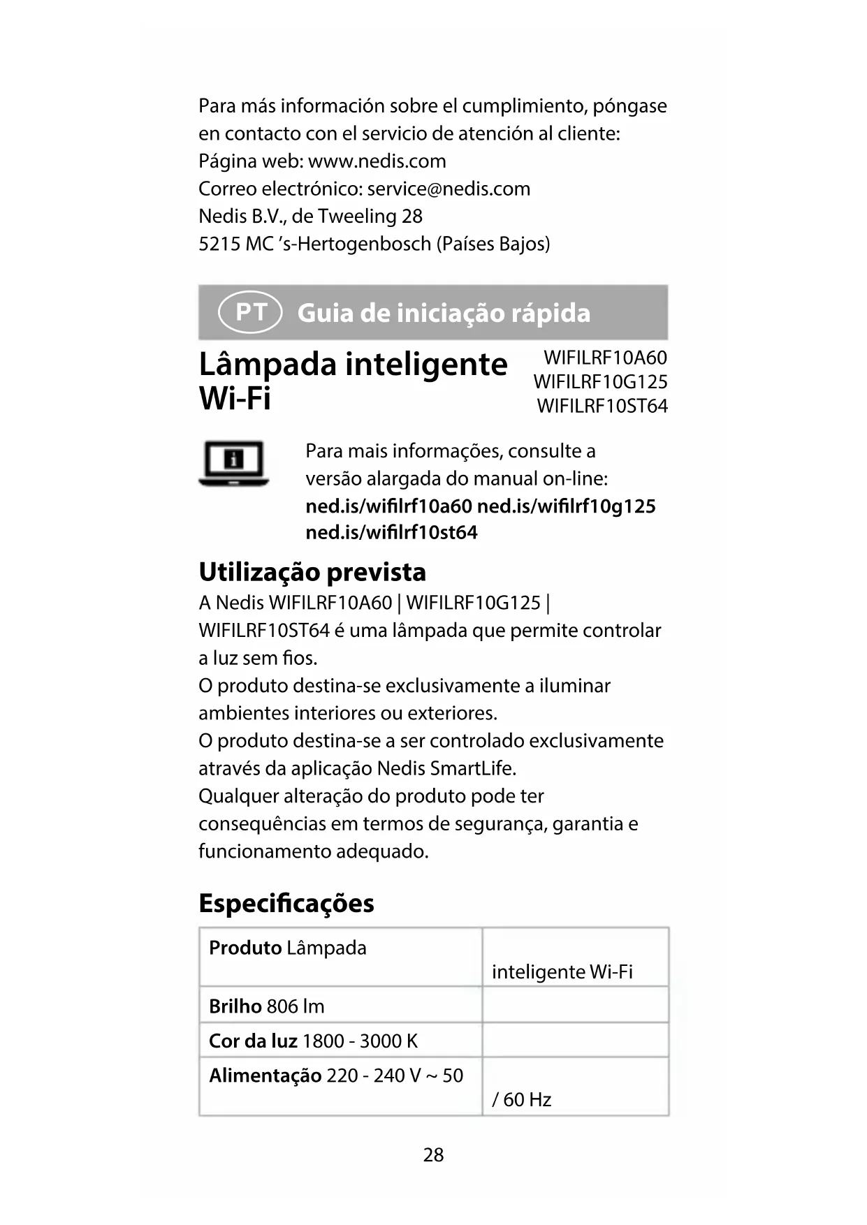 Guia de iniciação rápida Lâmpada inteligente Wi-Fi WIFILRF10A60 WIFILRF10G125 WIFILRF10ST64 Para mais informações, consulte a versão alargada do manual on-line: ned.is/wilrf10a60 ned.is/wilrf10g125 ned.is/wilrf10st64 Utilização prevista A Nedis WIFILRF10A60 | WIFILRF10G125 | WIFILRF10ST64 é uma lâmpada que permite controlar a luz sem os. O produto destina-se exclusivamente a iluminar ambientes interiores ou exteriores. O produto destina-se a ser controlado exclusivamente através da aplicação Nedis SmartLife. Qualquer alteração do produto pode ter consequências em termos de segurança, garantia e funcionamento adequado. Especicações Produto Lâmpada inteligente Wi-Fi Brilho 806 lm Cor da luz 1800 - 3000 K Alimentação 220 - 240 V ~ 50 / 60 Hz29 Tensão 7 W Corrente 43 mA Tecnologia sem os Wi-Fi Gama de frequências 2412 - 2472 MHz Potência de transmissão de rádio máx. 17 dBm Equipamento E27 Material Vidro Número de artigo Dimensões Peso WIFILRF10A60 Ø 60 x 105 mm 30 g WIFILRT10G125 Ø 125 x 172 mm 100 g WIFILRF10ST64 Ø 64 x 142 mm 46 g Peças principais (imagem A) 1 Lâmpada 2 Filamento 3 Contacto elétrico Instruções de segurança
