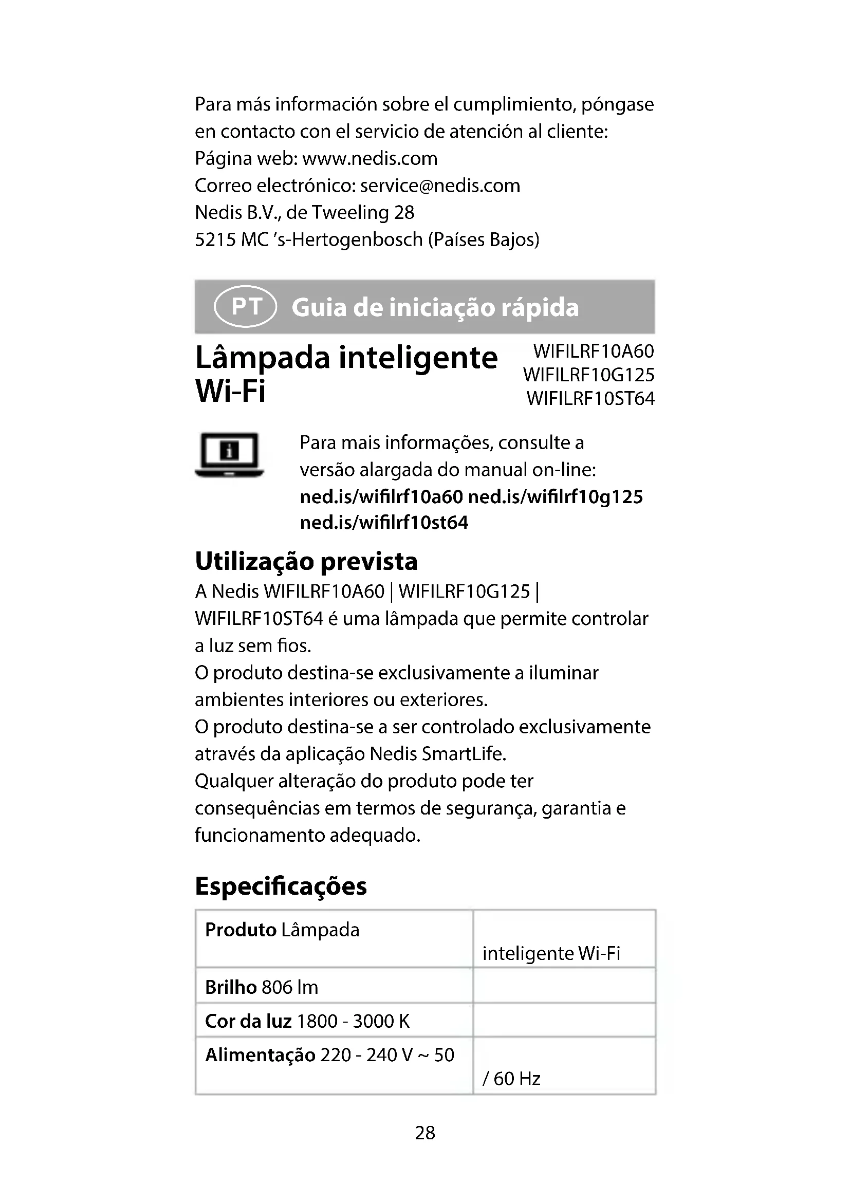Guia de iniciação rápida Lâmpada inteligente Wi-Fi WIFILRF10A60 WIFILRF10G125 WIFILRF10ST64 Para mais informações, consulte a versão alargada do manual on-line: ned.is/wilrf10a60 ned.is/wilrf10g125 ned.is/wilrf10st64 Utilização prevista A Nedis WIFILRF10A60 | WIFILRF10G125 | WIFILRF10ST64 é uma lâmpada que permite controlar a luz sem os. O produto destina-se exclusivamente a iluminar ambientes interiores ou exteriores. O produto destina-se a ser controlado exclusivamente através da aplicação Nedis SmartLife. Qualquer alteração do produto pode ter consequências em termos de segurança, garantia e funcionamento adequado. Especicações Produto Lâmpada inteligente Wi-Fi Brilho 806 lm Cor da luz 1800 - 3000 K Alimentação 220 - 240 V ~ 50 / 60 Hz29 Tensão 7 W Corrente 43 mA Tecnologia sem os Wi-Fi Gama de frequências 2412 - 2472 MHz Potência de transmissão de rádio máx. 17 dBm Equipamento E27 Material Vidro Número de artigo Dimensões Peso WIFILRF10A60 Ø 60 x 105 mm 30 g WIFILRT10G125 Ø 125 x 172 mm 100 g WIFILRF10ST64 Ø 64 x 142 mm 46 g Peças principais (imagem A) 1 Lâmpada 2 Filamento 3 Contacto elétrico Instruções de segurança