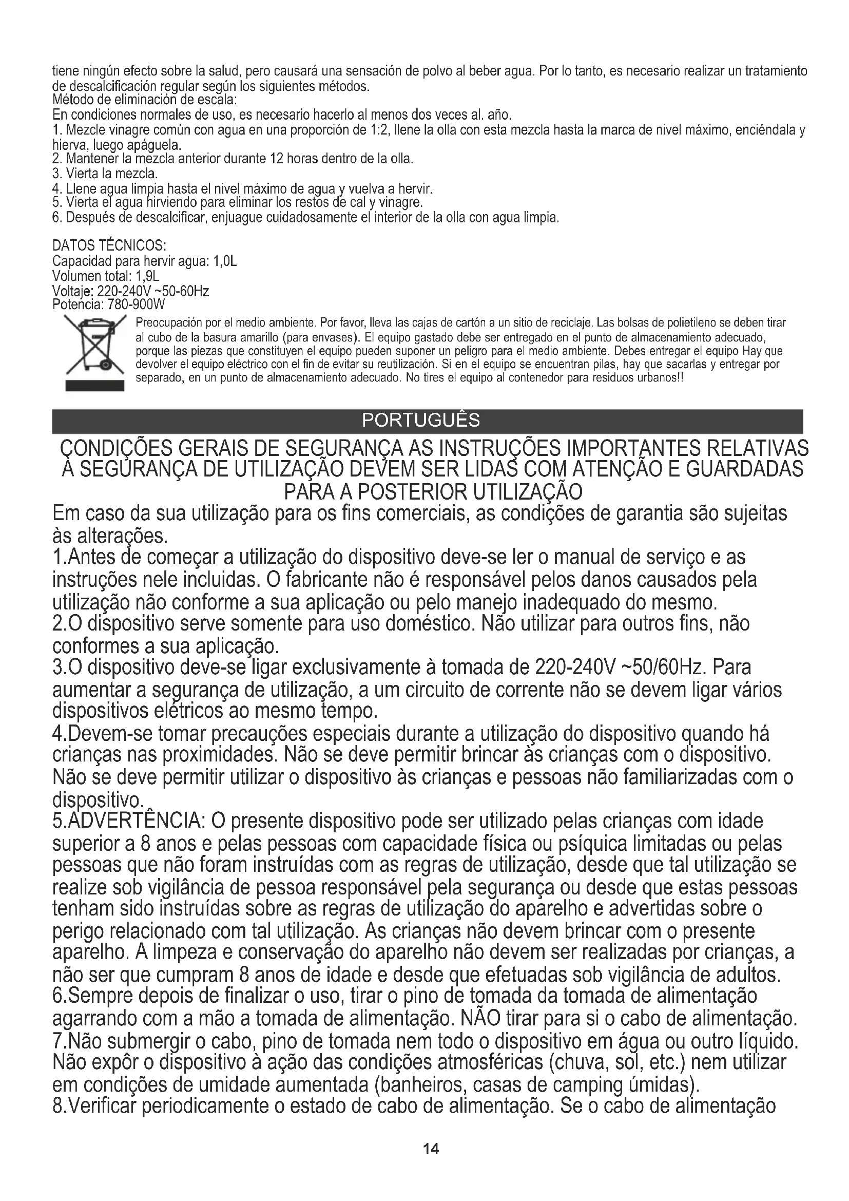 DATOS TÉCNICOS: Capacidad para hervir agua: 1,0L Volumen total: 1,9L Voltaje: 220-240V ~50-60Hz Potencia: 780-900W15 está deteriorado, então deve ser substituido por uma oficina de reparos especializada para evitar o perigo. 9.Não utilizar o dispositivo com o cabo de alimentação deteriorado ou se foi deixado cair ou foi deteriorado de qualquer outra maneira ou funciona de maneira incorreta. Não o dispositivo por conta própria porque existe perigo de choque eléctrico. O dispositivo deteriorado deve-se levar ao ponto de serviço técnico adequado para levar a cabo a verificação ou reparação. Todo tipo de reparações podem ser levadas a cabo somente pelos pontos de serviço técnico autorizados. A reparação realizada de maneira incorreta pode ser causa de grave perigo para o usuário." 10.O dispositivo deve-se colocar numa superfície fria, estável, plana, longe de aparelhos de cozinha que se esquentam como: cozinha elétrica, queimador a gas, etc. 11.Não utilizar o dispositivo perto de materiais inflamáveis.