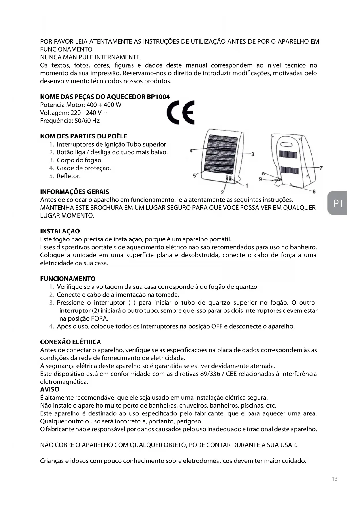 Signature et sceau du vendeur IMPORTANT : Pour que la garantie soit eective, le VENDEUR doit remplir, signer et tamponner ce Certicat. Pour bénécier d’une attention dans les conditions énoncées dans ce certicat, veuillez présenter ce document au Service Technique Autorisé avec la Facture d’Achat. POR FAVOR LEIA ATENTAMENTE AS INSTRUÇÕES DE UTILIZAÇÃO ANTES DE POR O APARELHO EM FUNCIONAMENTO. NUNCA MANIPULE INTERNAMENTE. Os textos, fotos, cores, guras e dados deste manual correspondem ao nível técnico no momento da sua impressão. Reservámo-nos o direito de introduzir modicações, motivadas pelo desenvolvimento técnicodos nossos produtos. NOME DAS PEÇAS DO AQUECEDOR BP1004 Potencia Motor: 400 + 400 W Voltagem: 220 - 240 V ~ Frequência: 50/60 Hz