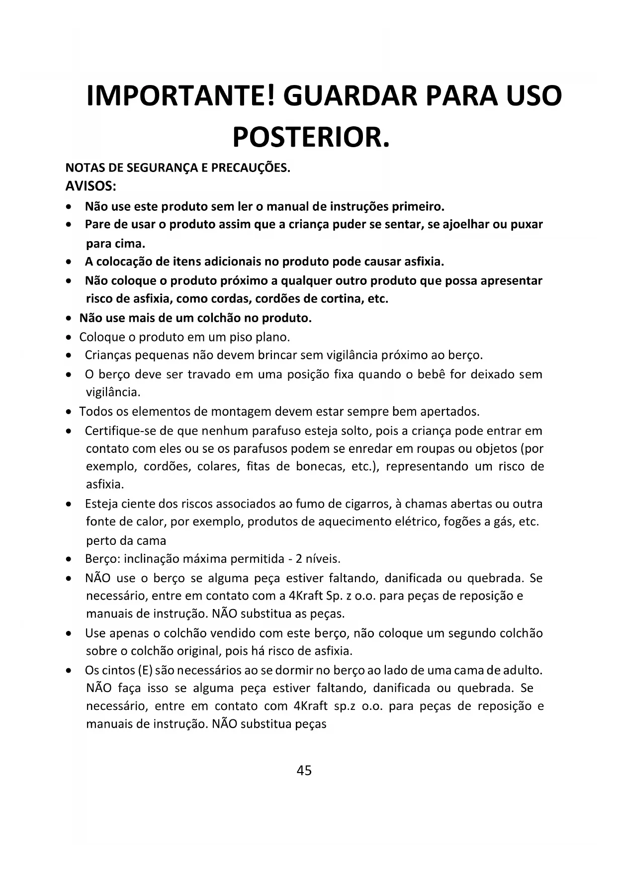 - NÃO use o berço se alguma peça estiver faltando, danificada ou quebrada. Se necessário, entre em contato com a 4Kraft Sp. z o.o. para peças de reposição e manuais de instrução. NÃO substitua as peças.