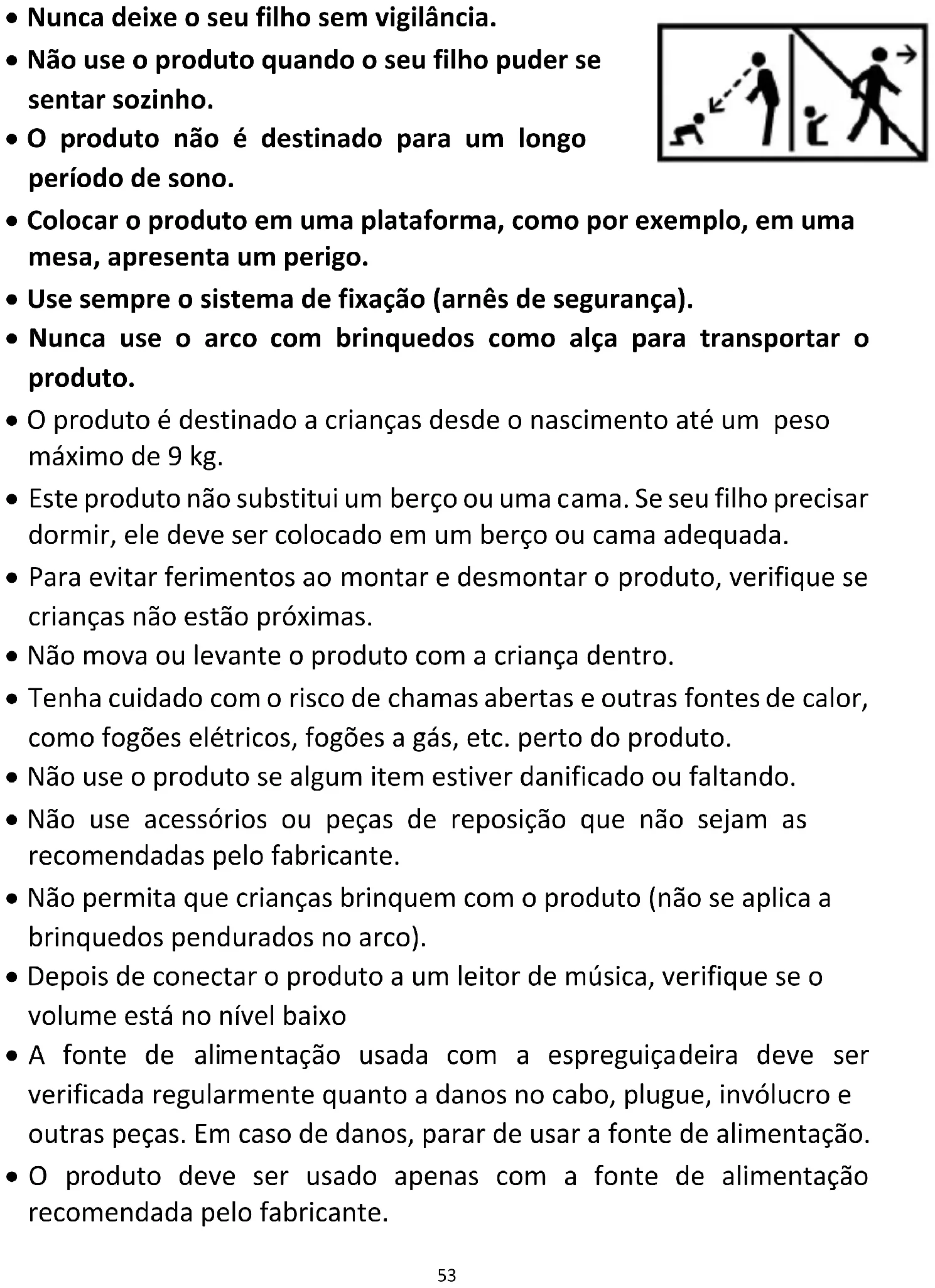 - Este produto não substitui um berço ou uma cama. Se seu filho precisar dormir, ele deve ser colocado em um berço ou cama adequada.
