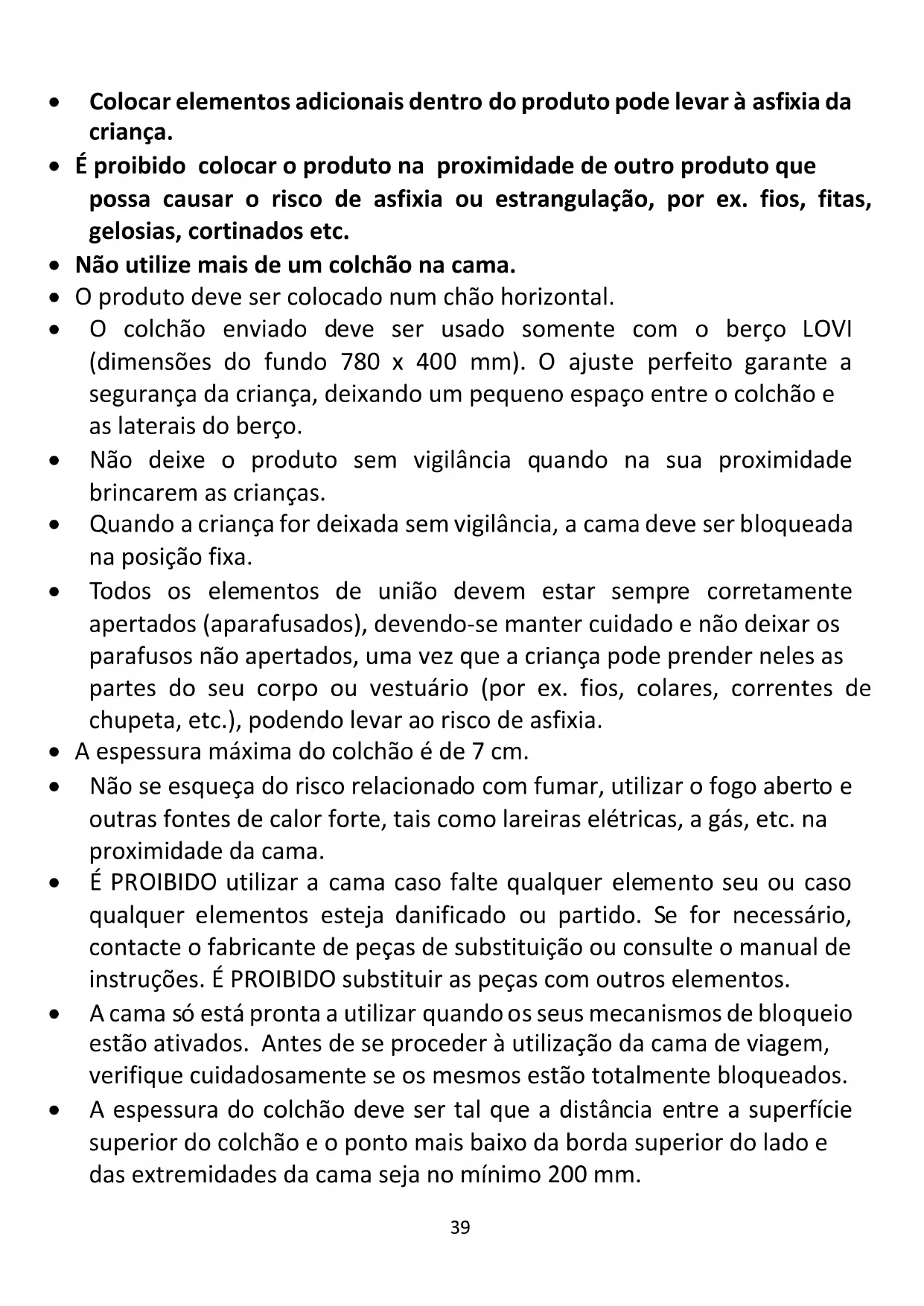 - O colchão enviado deve ser usado somente com o berço LOVI (dimensões do fundo 780 x 400 mm). O ajuste perfeito garante a segurança da criança, deixando um pequeno espaço entre o colchão e as laterais do berço.
