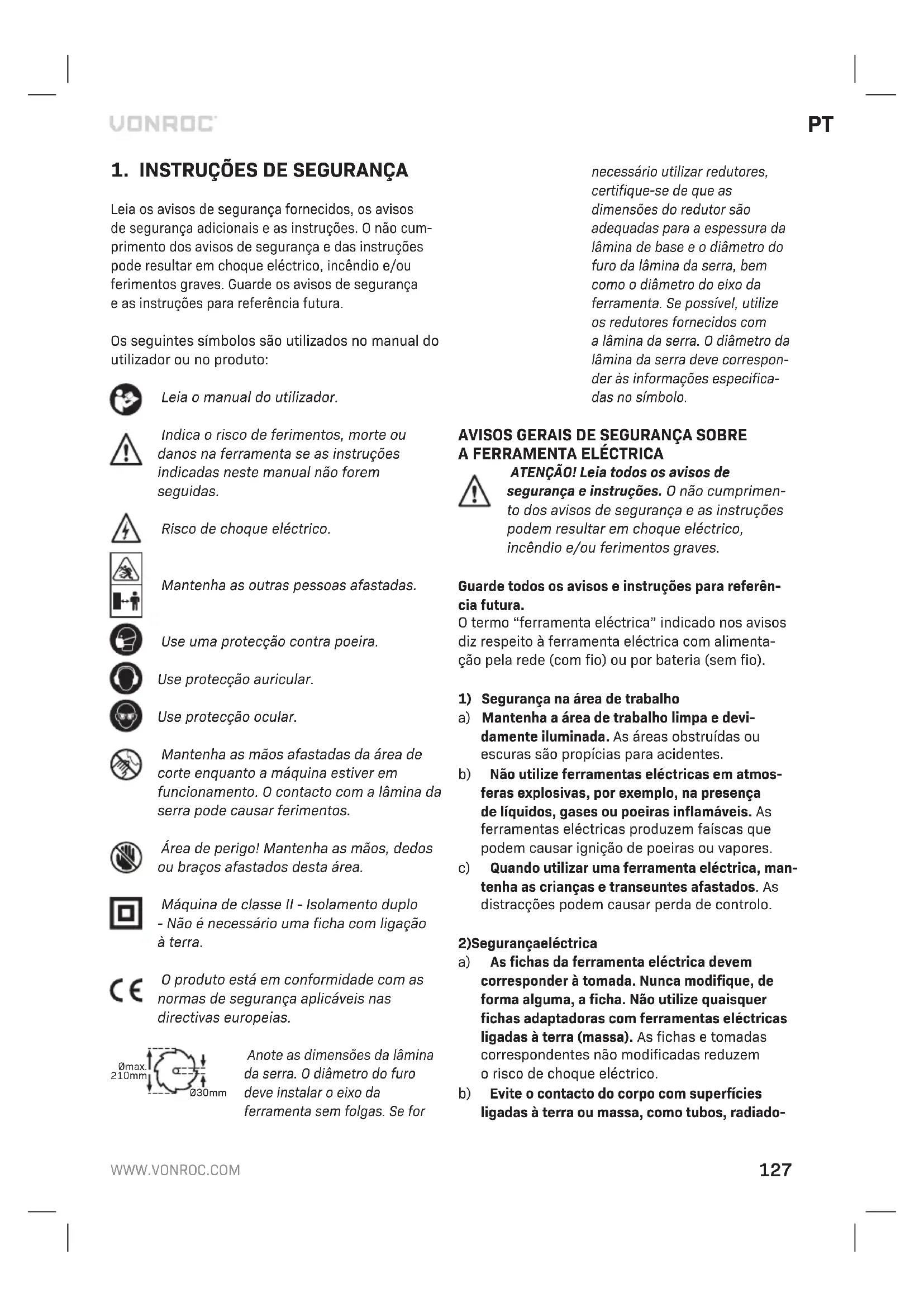 Leia os avisos de segurança fornecidos, os avisos de segurança adicionais eas instruções. Onão cum- primento dos avisos de segurança edas instruções pode resultar em choque eléctrico, incêndio e/ou ferimentos graves. Guarde os avisos de segurança eas instruções para referência futura. Os seguintes símbolos são utilizados no manual do utilizador ou no produto: Leia omanual do utilizador. Indica orisco de ferimentos, morte ou danos na ferramenta se as instruções indicadas neste manual não forem seguidas. Risco de choque eléctrico. Mantenha as outras pessoas afastadas. Use uma protecção contra poeira. Use protecção auricular. Use protecção ocular. Mantenha as mãos afastadas da área de corte enquanto amáquina estiver em funcionamento. Ocontacto com alâmina da serra pode causar ferimentos. Área de perigo! Mantenha as mãos, dedos ou braços afastados desta área. Máquina de classe II - Isolamento duplo - Não é necessário uma ficha com ligação àterra. Oproduto está em conformidade com as normas de segurança aplicáveis nas directivas europeias. Ø30mm Ømax. 210mm Anote as dimensões da lâmina da serra. Odiâmetro do furo deve instalar oeixo da ferramenta sem folgas. Se for necessário utilizar redutores, certifique-se de que as dimensões do redutor são adequadas para aespessura da lâmina de base eodiâmetro do furo da lâmina da serra, bem como odiâmetro do eixo da ferramenta. Se possível, utilize os redutores fornecidos com alâmina da serra. Odiâmetro da lâmina da serra deve correspon- der às informações especifica- das no símbolo.