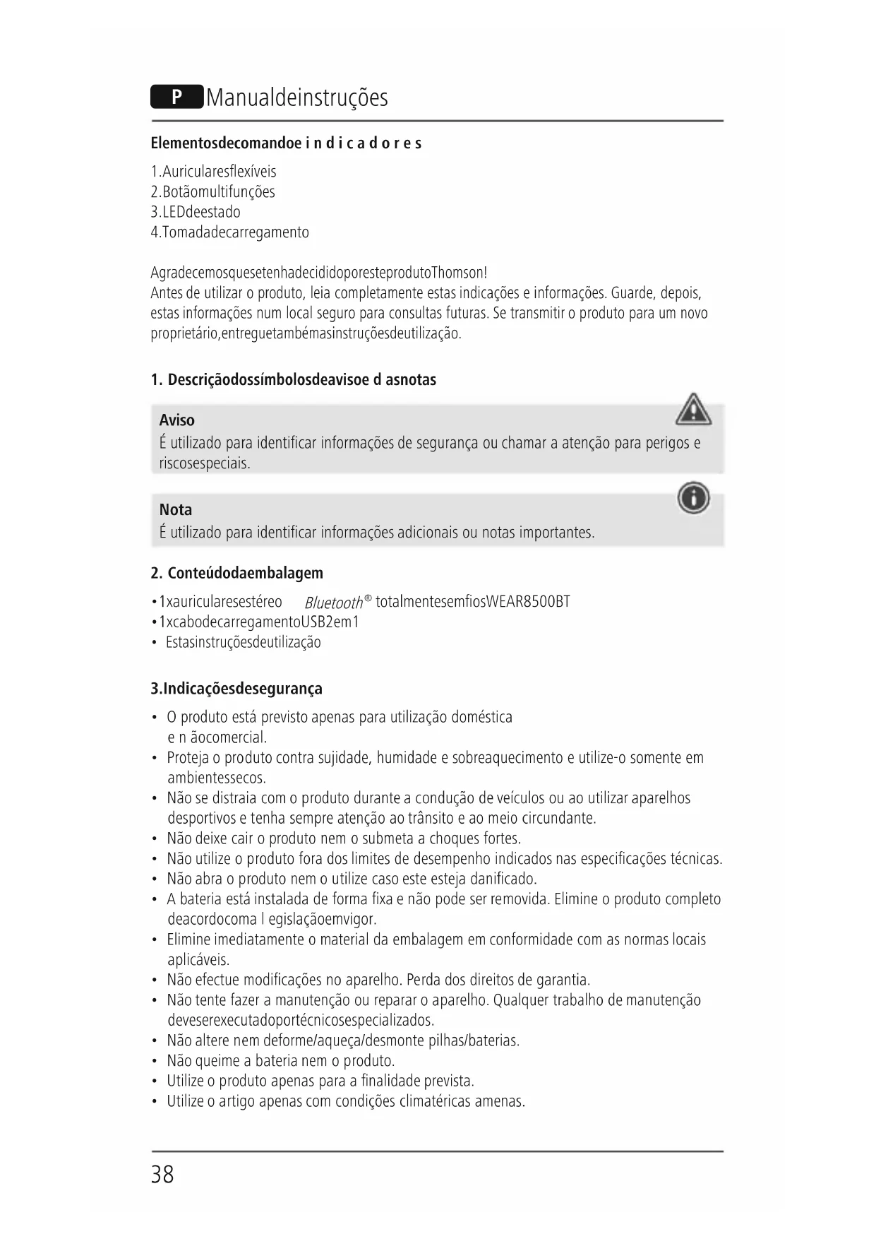 - Autilização do produto limita aperceção de ruídos ambiente. Por conseguinte, durante autilização, não operequaisquer veículos ou máquinas. Aviso –Bateria