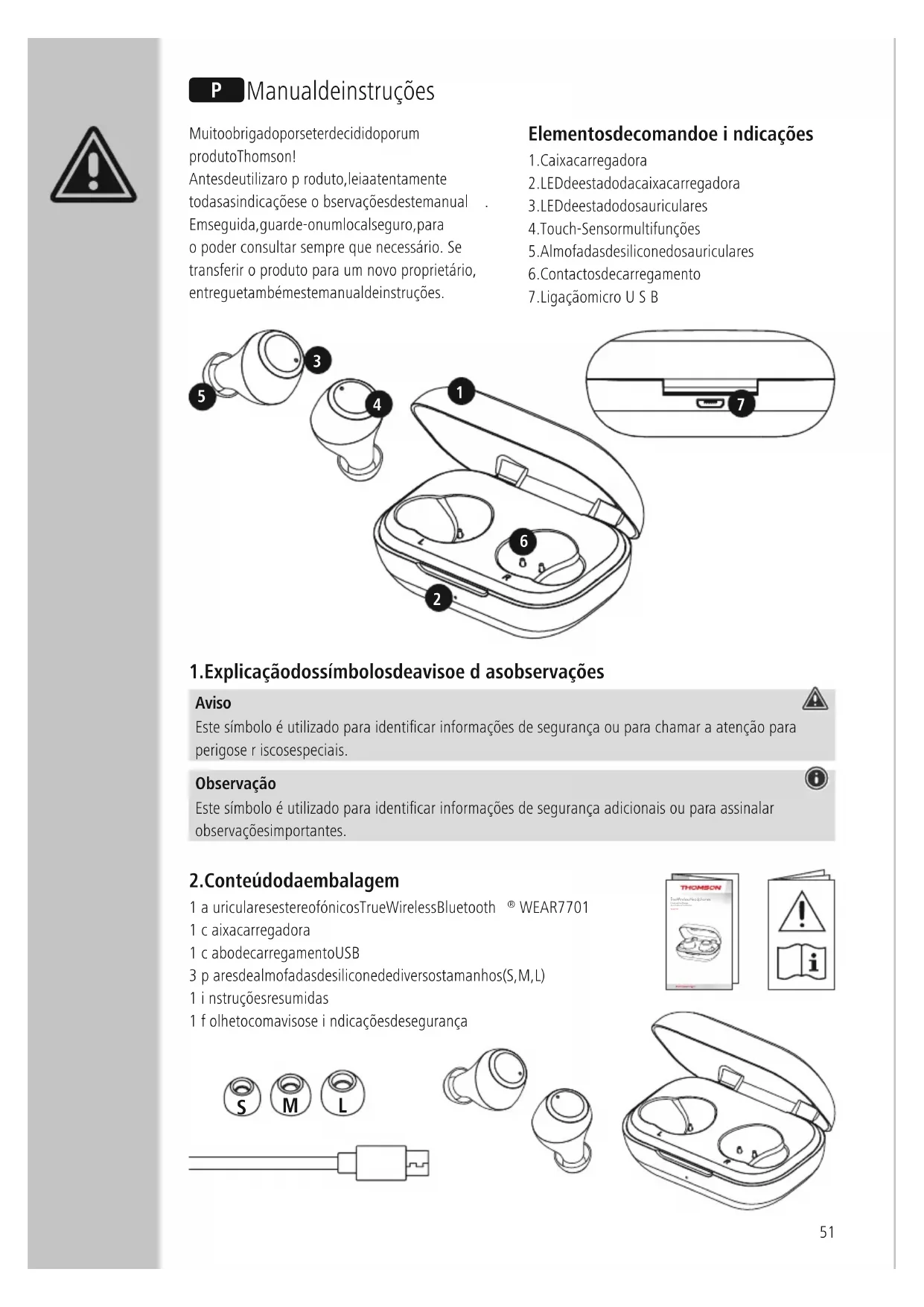 WEAR 7701 1caixa carregadora 1cabo de carregamento USB 3pares de almofadas de silicone de diversos tamanhos (S, M, L) 1instruções resumidas 1folheto com avisos eindicações de segurança O Manual de instruções True Wireless HeadphonesÉcouteurs TrueWirelessAuscultadores TrueWirelessWEAR7701