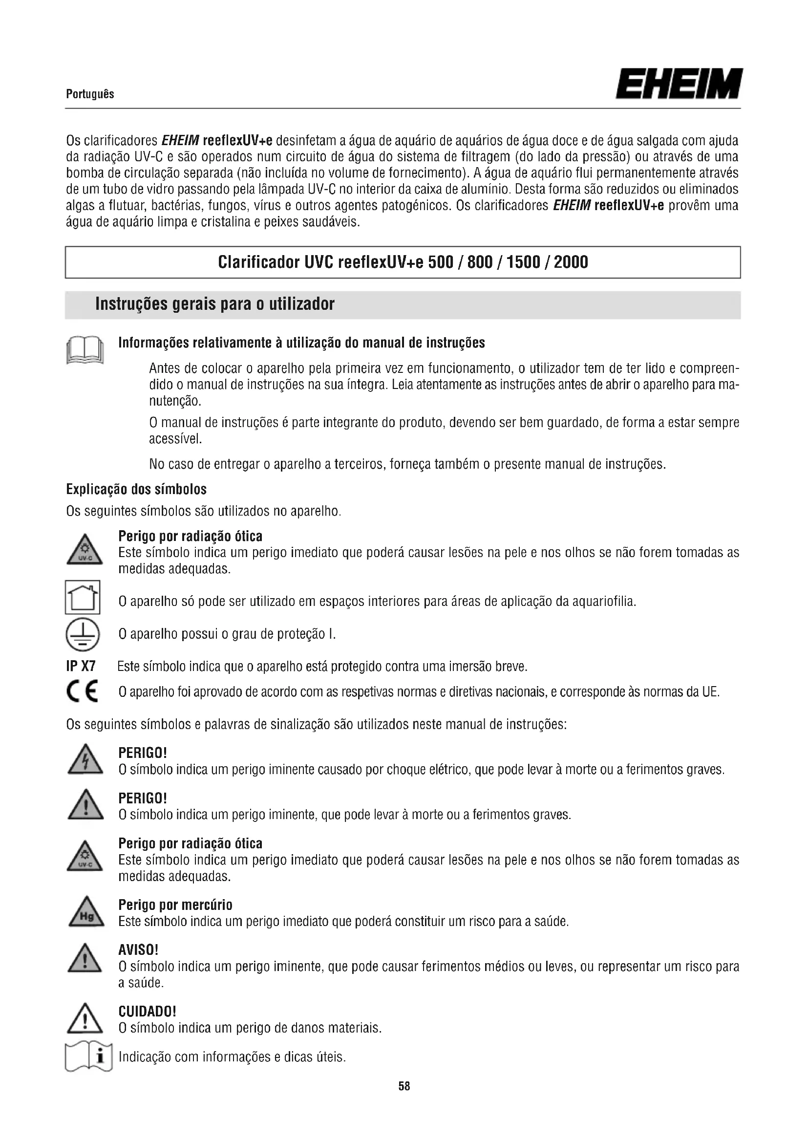 Português Os clarificadores EHEIM reeflexUV+e desinfetam a água de aquário de aquários de água doce e de água salgada com ajuda da radiação UV-C e são operados num circuito de água do sistema de filtragem (do lado da pressão) ou através de uma bomba de circulação separada (não incluída no volume de fornecimento). A água de aquário flui permanentemente através de um tubo de vidro passando pela lâmpada UV-C no interior da caixa de alumínio. Desta forma são reduzidos ou eliminados algas a flutuar, bactérias, fungos, vírus e outros agentes patogénicos. Os clarificadores EHEIM reeflexUV+e provêm uma água de aquário limpa e cristalina e peixes saudáveis. Instruções gerais para o utilizador Informações relativamente à utilização do manual de instruções Antes de colocar o aparelho pela primeira vez em funcionamento, o utilizador tem de ter lido e compreen- dido o manual de instruções na sua íntegra. Leia atentamente as instruções antes de abrir o aparelho para ma- nutenção. O manual de instruções é parte integrante do produto, devendo ser bem guardado, de forma a estar sempre acessível. No caso de entregar o aparelho a terceiros, forneça também o presente manual de instruções. Explicação dos símbolos Os seguintes símbolos são utilizados no aparelho. Perigo por radiação ótica Este símbolo indica um perigo imediato que poderá causar lesões na pele e nos olhos se não forem tomadas as medidas adequadas. O aparelho só pode ser utilizado em espaços interiores para áreas de aplicação da aquariofilia. O aparelho possui o grau de proteção I. IP X7 Este símbolo indica que o aparelho está protegido contra uma imersão breve. O aparelho foi aprovado de acordo com as respetivas normas e diretivas nacionais, e corresponde às normas da UE. Os seguintes símbolos e palavras de sinalização são utilizados neste manual de instruções: PERIGO! O símbolo indica um perigo iminente causado por choque elétrico, que pode levar à morte ou a ferimentos graves. PERIGO! O símbolo indica um perigo iminente, que pode levar à morte ou a ferimentos graves. Perigo por radiação ótica Este símbolo indica um perigo imediato que poderá causar lesões na pele e nos olhos se não forem tomadas as medidas adequadas. Perigo por mercúrio Este símbolo indica um perigo imediato que poderá constituir um risco para a saúde. AVISO! O símbolo indica um perigo iminente, que pode causar ferimentos médios ou leves, ou representar um risco para a saúde. CUIDADO! O símbolo indica um perigo de danos materiais. Indicação com informações e dicas úteis. Clarificador UVC reeflexUV+e 500 / 800 / 1500 / 200059 Âmbito de aplicação O aparelho e todas as peças incluídas no volume de fornecimento destinam-se ao uso privado, podendo exclusivamente ser utilizados da seguinte forma: