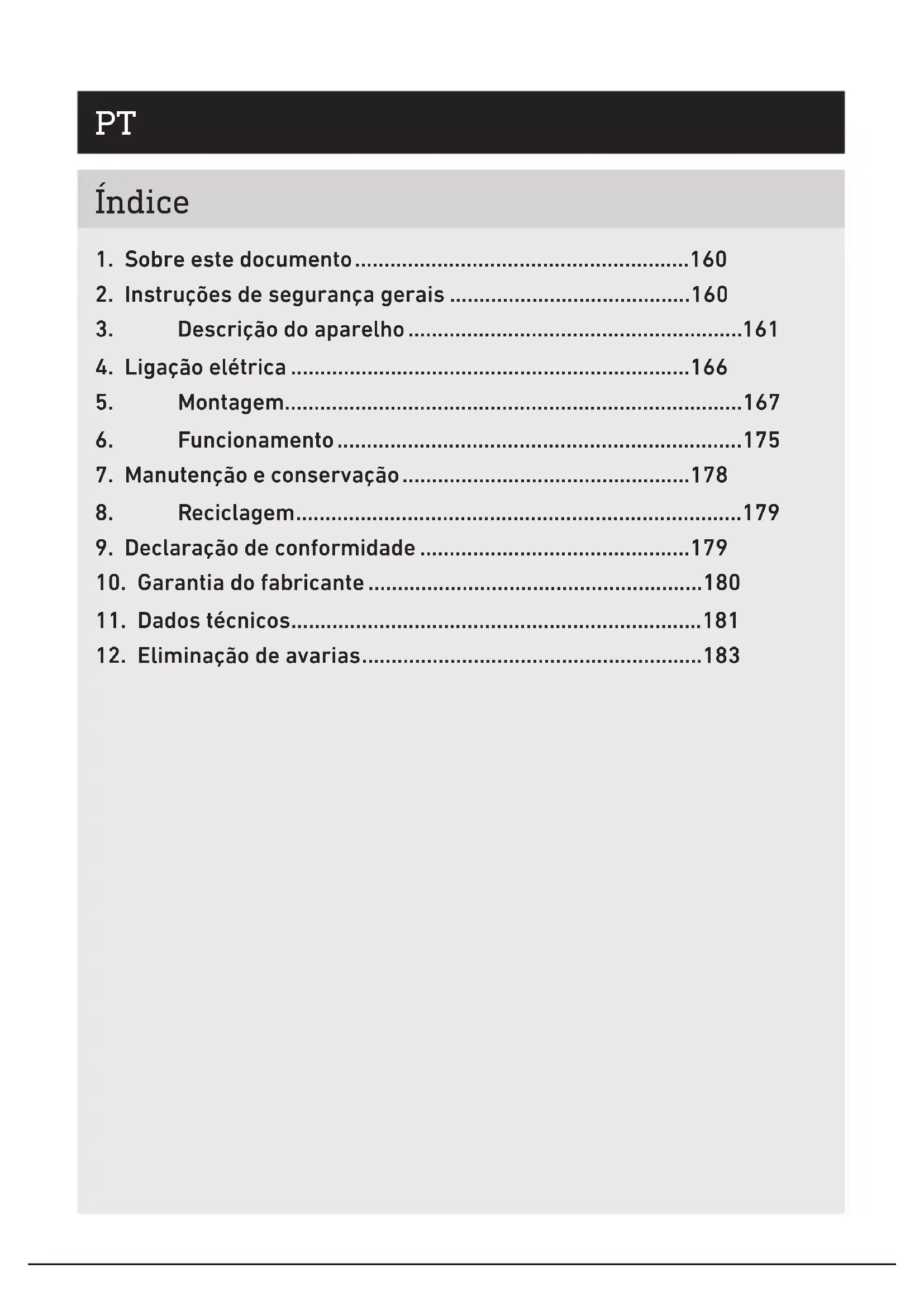 12. Eliminação de avarias ..........................................................183– 160 – Índice