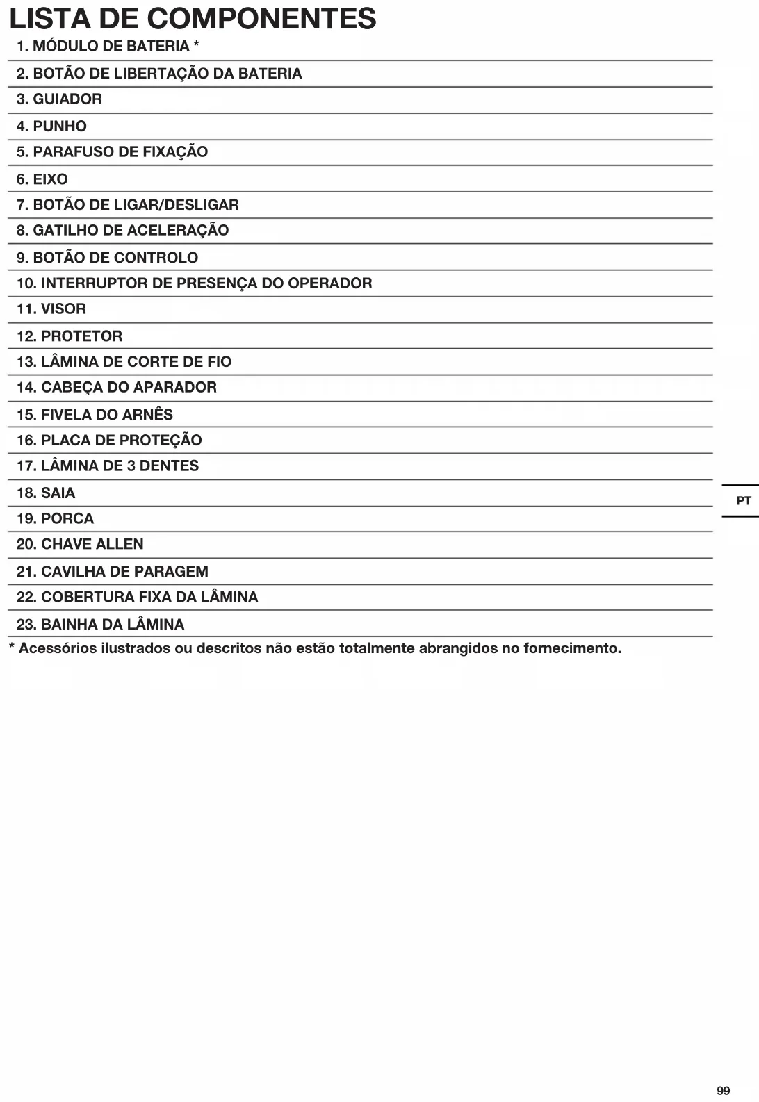 - Acessórios ilustrados ou descritos não estão totalmente abrangidos no fornecimento.100