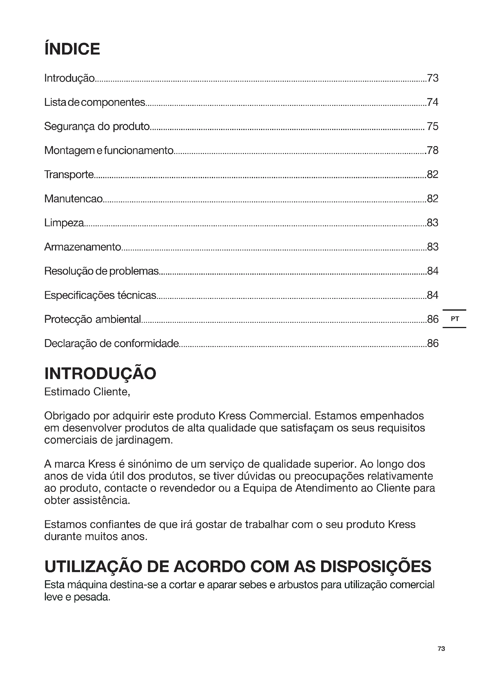 - Declaração de conformidade INTRODUÇÃO Estimado Cliente, Obrigado por adquirir este produto Kress Commercial. Estamos empenhados em desenvolver produtos de alta qualidade que satisfaçam os seus requisitos comerciais de jardinagem. A marca Kress é sinónimo de um serviço de qualidade superior. Ao longo dos anos de vida útil dos produtos, se tiver dúvidas ou preocupações relativamente ao produto, contacte o revendedor ou a Equipa de Atendimento ao Cliente para obter assistência. Estamos conantes de que irá gostar de trabalhar com o seu produto Kress durante muitos anos. UTILIZAÇÃO DE ACORDO COM AS DISPOSIÇÕES Esta máquina destina-se a cortar e aparar sebes e arbustos para utilização comercial leve e pesada.74 p. 86