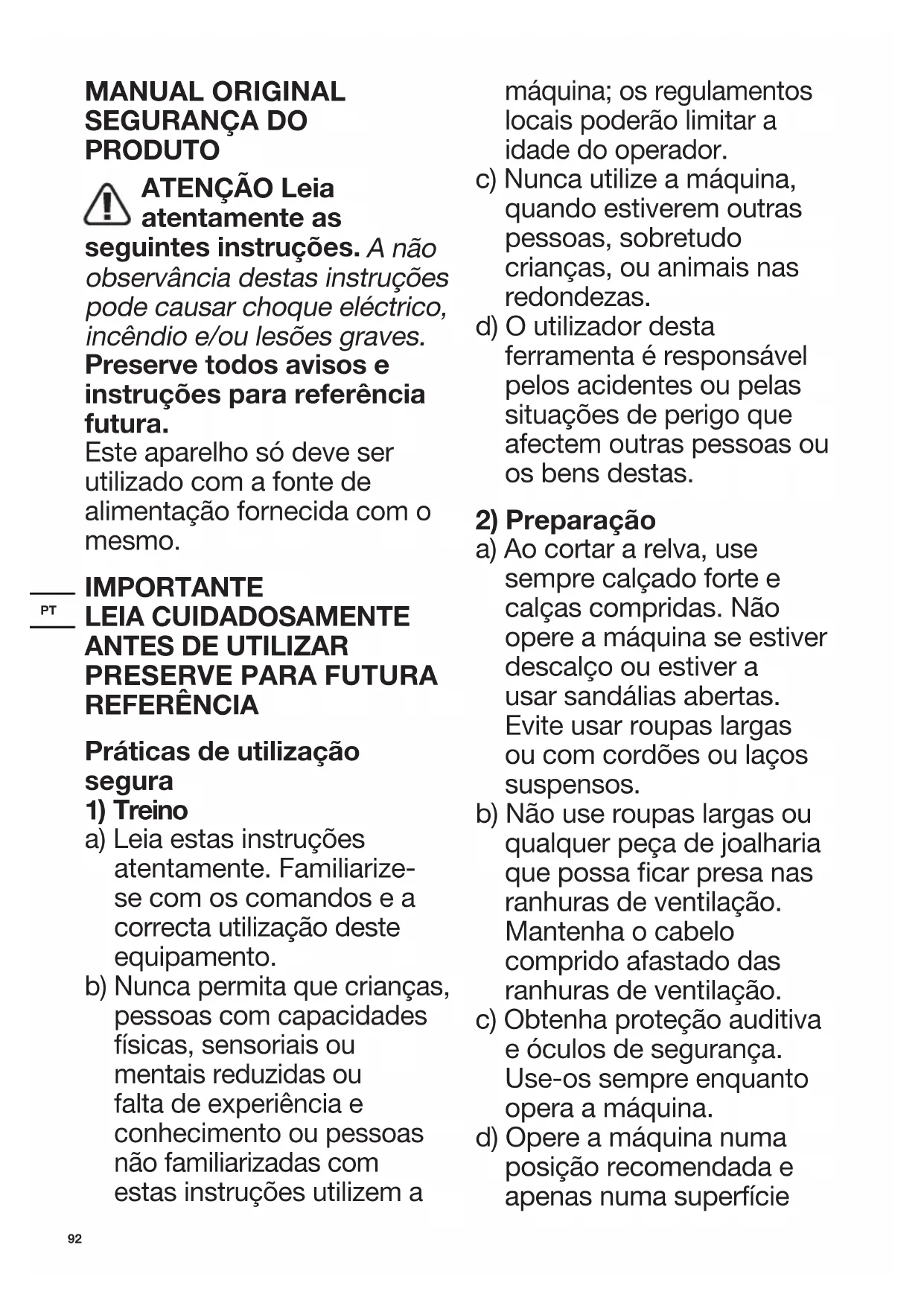 a) Leia estas instruções atentamente. Familiarize- se com os comandos e a correcta utilização deste equipamento. b) Nunca permita que crianças, pessoas com capacidades físicas, sensoriais ou mentais reduzidas ou falta de experiência e conhecimento ou pessoas não familiarizadas com estas instruções utilizem a máquina; os regulamentos locais poderão limitar a idade do operador. c) Nunca utilize a máquina, quando estiverem outras pessoas, sobretudo crianças, ou animais nas redondezas. d) O utilizador desta ferramenta é responsável pelos acidentes ou pelas situações de perigo que afectem outras pessoas ou os bens destas.