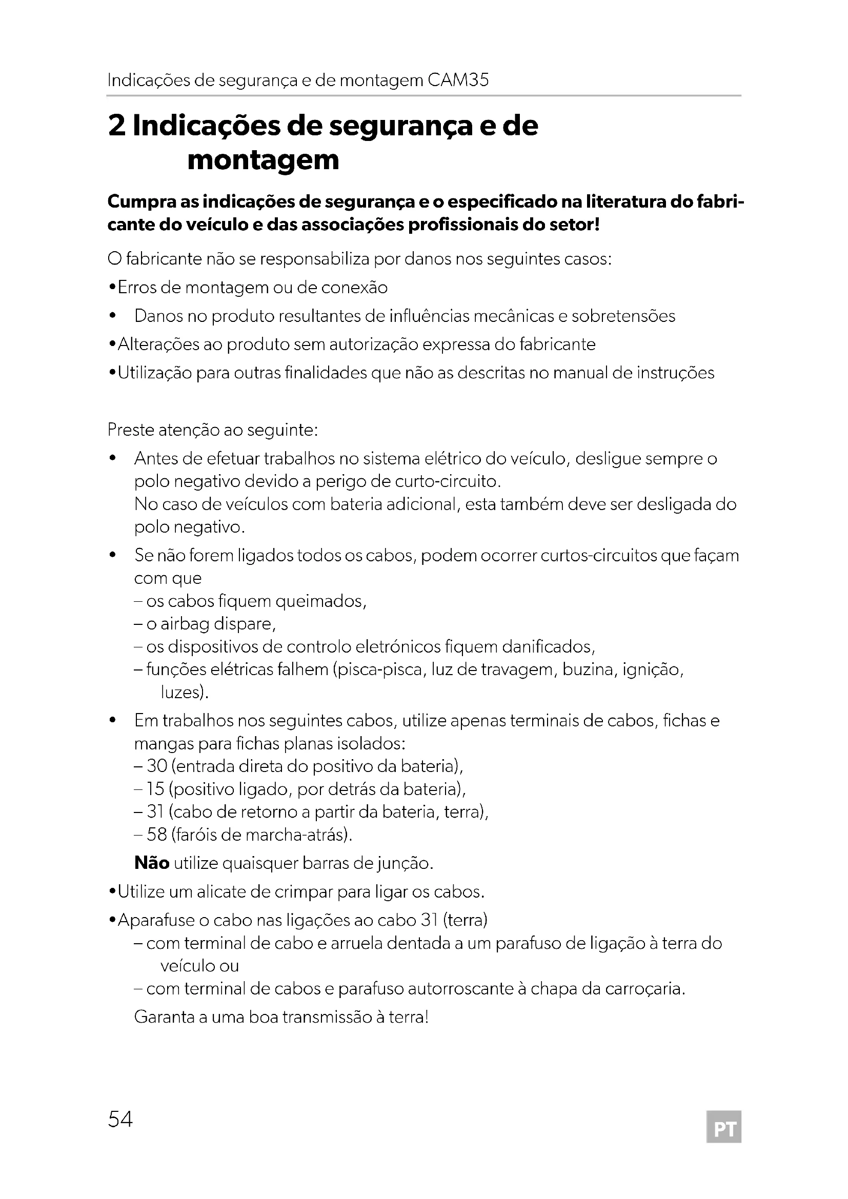 - Aparafuse o cabo nas ligações ao cabo 31 (terra) – com terminal de cabo e arruela dentada a um parafuso de ligação à terra do veículo ou – com terminal de cabos e parafuso autorroscante à chapa da carroçaria. Garanta a uma boa transmissão à terra! CAM35-IO-16s.book Seite 54 Dienstag, 21. Februar 2017 5:31 17PT CAM35 Indicações de segurança e de montagem