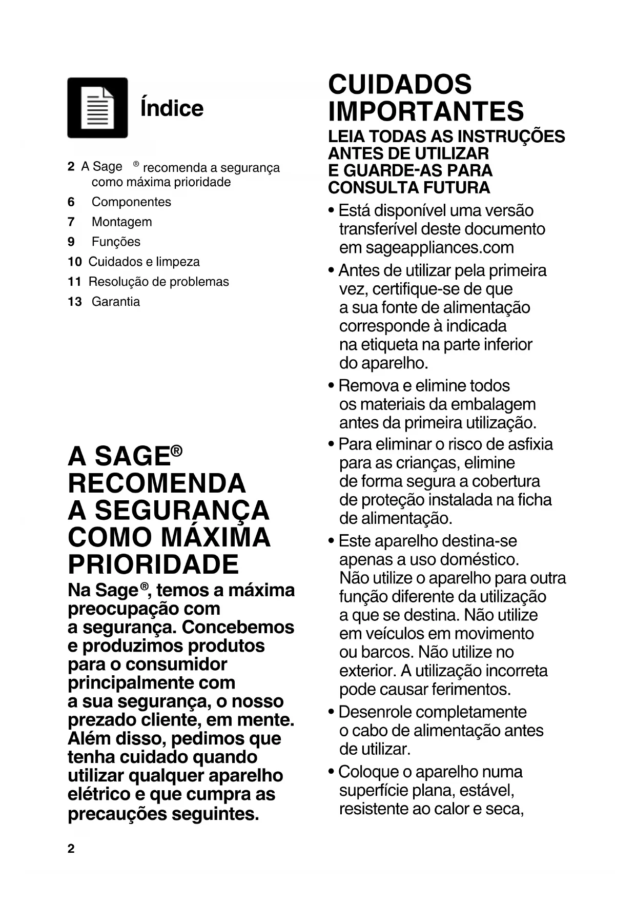 2 A Sage recomenda a segurança como máxima prioridade6 Componentes7 Montagem9 Funções10 Cuidados e limpeza11 Resolução de problemas13 Garantia Índice A SAGE