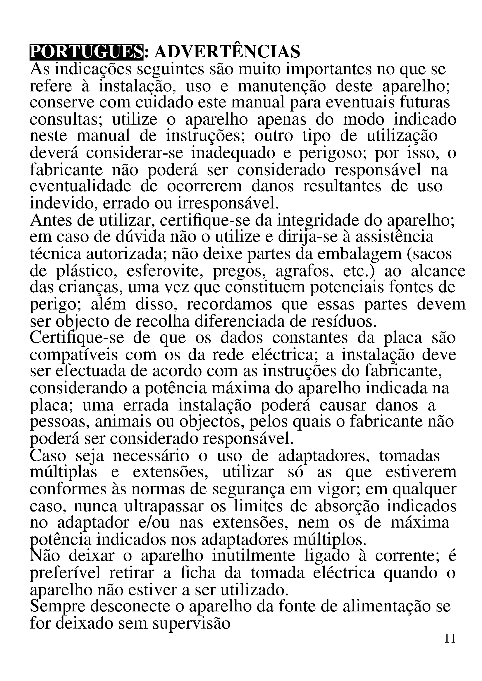 As indicações seguintes são muito importantes no que se refere à instalação, uso e manutenção deste aparelho; conserve com cuidado este manual para eventuais futuras consultas; utilize o aparelho apenas do modo indicado neste manual de instruções; outro tipo de utilização deverá considerar-se inadequado e perigoso; por isso, o fabricante não poderá ser considerado responsável na eventualidade de ocorrerem danos resultantes de uso indevido, errado ou irresponsável. Antes de utilizar, certifique-se da integridade do aparelho; em caso de dúvida não o utilize e dirija-se à assistência técnica autorizada; não deixe partes da embalagem (sacos de plástico, esferovite, pregos, agrafos, etc.) ao alcance das crianças, uma vez que constituem potenciais fontes de perigo; além disso, recordamos que essas partes devem ser objecto de recolha diferenciada de resíduos. Certifique-se de que os dados constantes da placa são compatíveis com os da rede eléctrica; a instalação deve ser efectuada de acordo com as instruções do fabricante, considerando a potência máxima do aparelho indicada na placa; uma errada instalação poderá causar danos a pessoas, animais ou objectos, pelos quais o fabricante não poderá ser considerado responsável. Caso seja necessário o uso de adaptadores, tomadas múltiplas e extensões, utilizar só as que estiverem conformes às normas de segurança em vigor; em qualquer caso, nunca ultrapassar os limites de absorção indicados no adaptador e/ou nas extensões, nem os de máxima potência indicados nos adaptadores múltiplos. Não deixar o aparelho inutilmente ligado à corrente; é preferível retirar a ficha da tomada eléctrica quando o aparelho não estiver a ser utilizado. Sempre desconecte o aparelho da fonte de alimentação se for deixado sem supervisão12 As operações de limpeza devem ser efectuadas depois de se ter desligado a ficha da tomada eléctrica. Sempre que o aparelho estiver fora de uso e seja decidido não o reparar, recomenda-se a sua inutilização, cortando- lhe o cabo de alimentação; - Não aproximar o cabo de alimentação de objectos cortantes ou de superfícies quentes, e não o puxar para arrancar a ficha da tomada eléctrica. Não deixe que ele fique pendurado na bancada onde a criança pode segurá- lo. Não utilizar o aparelho no caso de o cabo de alimentação ou a ficha se encontrarem danificados, ou em caso de curto-circuitos; Nessa eventualidade, leve o aparelho a um centro de assistência autorizado. - Não expor o aparelho a condições atmosféricas adversas, como chuva, humidade, gelo. Conserve em lugar seco. - Não manusear ou tocar o aparelho com as mãos molhadas ou os pés descalços. - Este aparelho não pode ser usado por crianças, mesmo com mais de 8 anos. - Este aparelho pode ser por pessoas com reduzida capacidade física, sensorial ou mental, ou ainda com falta de experiência na sua utilização, desde que lhes seja assegurada uma adequada supervisão ou se tiverem sido instruídas no uso do aparelho em segurança. - As crianças não devem brincar com o aparelho. - Mantenha o aparelho e o cabo de alimentação fora do alcance de crianças com menos de 8 anos de idade. Se o cabo de alimentação estiver danificado, ou em caso de falha e / ou avaria, não mexa no aparelho. Qualquer reparação deve ser realizada pelo fabricante ou pelo seu serviço de assistência técnica ou, em qualquer caso, por uma pessoa com qualificação semelhante, a fim de evitar qualquer risco. O não cumprimento dos itens acima pode comprometer a segurança do equipamento e invalidar os termos da garantia.13 ATENÇÃO: este aparelho inclui uma função de aquecimento. Algumas superfícies, mesmo que não a placa propriamente dita, poderão atingir temperaturas elevadas. Uma vez que a sensibilidade à temperatura difere de pessoa para pessoa, este aparelho deverá ser usado com CUIDADO. Coloque o aparelho exclusivamente sobre superfícies com aderência e preparadas para o efeito - Este aparelho foi concebido para uso doméstico ou equivalente, em situações como as de refeitórios em pequenas empresas ou outros ambientes de natureza laboral; por clientes de hotéis, motéis ou acomodação turística, como turismo rural ou residencial. - Este aparelho não foi concebido para ser utilizado por intermédio de um temporizador externo ou de um sistema de comando à distância autónomo. - Antes de cada utilização, soltar o cabo de alimentação. - Utilizar somente acessórios e componentes originais. - Não sujeite a impactos, pois isso pode danificá-lo. - Manter o aparelho afastado de materiais inflamáveis, fontes de calor, zonas frias e vapor.