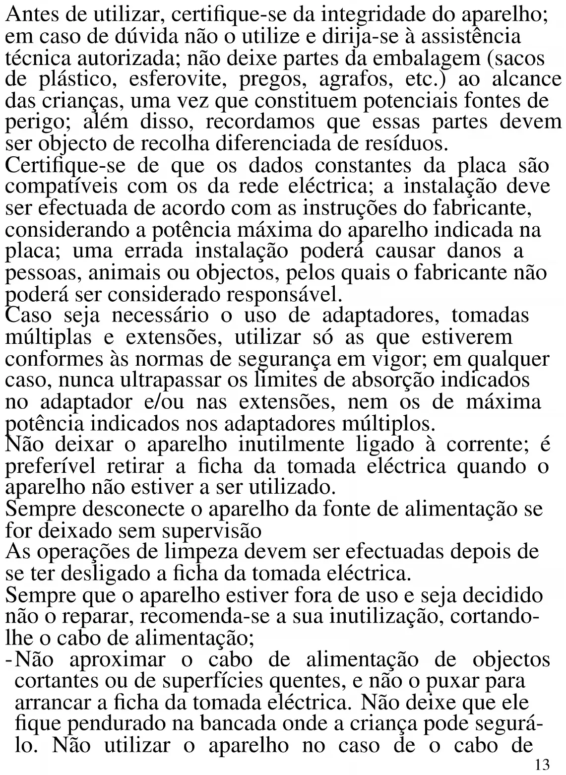 As indicações seguintes são muito importantes no que se refere à instalação, uso e manutenção deste aparelho; conserve com cuidado este manual para eventuais futuras consultas; utilize o aparelho apenas do modo indicado neste manual de instruções; outro tipo de utilização deverá considerar-se inadequado e perigoso; por isso, o fabricante não poderá ser considerado responsável na eventualidade de ocorrerem danos resultantes de uso indevido, errado ou irresponsável.13 Antes de utilizar, certifique-se da integridade do aparelho; em caso de dúvida não o utilize e dirija-se à assistência técnica autorizada; não deixe partes da embalagem (sacos de plástico, esferovite, pregos, agrafos, etc.) ao alcance das crianças, uma vez que constituem potenciais fontes de perigo; além disso, recordamos que essas partes devem ser objecto de recolha diferenciada de resíduos. Certifique-se de que os dados constantes da placa são compatíveis com os da rede eléctrica; a instalação deve ser efectuada de acordo com as instruções do fabricante, considerando a potência máxima do aparelho indicada na placa; uma errada instalação poderá causar danos a pessoas, animais ou objectos, pelos quais o fabricante não poderá ser considerado responsável. Caso seja necessário o uso de adaptadores, tomadas múltiplas e extensões, utilizar só as que estiverem conformes às normas de segurança em vigor; em qualquer caso, nunca ultrapassar os limites de absorção indicados no adaptador e/ou nas extensões, nem os de máxima potência indicados nos adaptadores múltiplos. Não deixar o aparelho inutilmente ligado à corrente; é preferível retirar a ficha da tomada eléctrica quando o aparelho não estiver a ser utilizado. Sempre desconecte o aparelho da fonte de alimentação se for deixado sem supervisão As operações de limpeza devem ser efectuadas depois de se ter desligado a ficha da tomada eléctrica. Sempre que o aparelho estiver fora de uso e seja decidido não o reparar, recomenda-se a sua inutilização, cortando- lhe o cabo de alimentação; - Não aproximar o cabo de alimentação de objectos cortantes ou de superfícies quentes, e não o puxar para arrancar a ficha da tomada eléctrica. Não deixe que ele fique pendurado na bancada onde a criança pode segurá- lo. Não utilizar o aparelho no caso de o cabo de14 alimentação ou a ficha se encontrarem danificados, ou em caso de curto-circuitos; Nessa eventualidade, leve o aparelho a um centro de assistência autorizado. - Não expor o aparelho a condições atmosféricas adversas, como chuva, humidade, gelo, etc. Conserve-o em lugares secos. - Não manusear ou tocar o aparelho com as mãos molhadas ou os pés descalços. - Este aparelho não pode ser usado por crianças, mesmo com mais de 8 anos. - Este aparelho pode ser por pessoas com reduzida capacidade física, sensorial ou mental, ou ainda com falta de experiência na sua utilização, desde que lhes seja assegurada uma adequada supervisão ou se tiverem sido instruídas no uso do aparelho em segurança. - As crianças não devem brincar com o aparelho. - Mantenha o aparelho e o cabo de alimentação fora do alcance de crianças com menos de 8 anos de idade. Se o cabo de alimentação estiver danificado, ou em caso de falha e / ou avaria, não mexa no aparelho. Qualquer reparação deve ser realizada pelo fabricante ou pelo seu serviço de assistência técnica ou, em qualquer caso, por uma pessoa com qualificação semelhante, a fim de evitar qualquer risco. O não cumprimento dos itens acima pode comprometer a segurança do equipamento e invalidar os termos da garantia. - Este aparelho foi concebido para uso doméstico ou equivalente, em situações como as de refeitórios em pequenas empresas ou outros ambientes de natureza laboral; por clientes de hotéis, motéis ou acomodação turística, como turismo rural ou residencial. - Este aparelho não foi concebido para ser utilizado por intermédio de um temporizador externo ou de um sistema de comando à distância autónomo. - Antes de cada utilização, soltar o cabo de alimentação.15 - Utilizar somente acessórios e componentes originais. - Não sujeite o produto a impactos, pois isso pode danificá-lo. - Manter o aparelho afastado de materiais inflamáveis, fontes de calor, zonas frias e vapor.