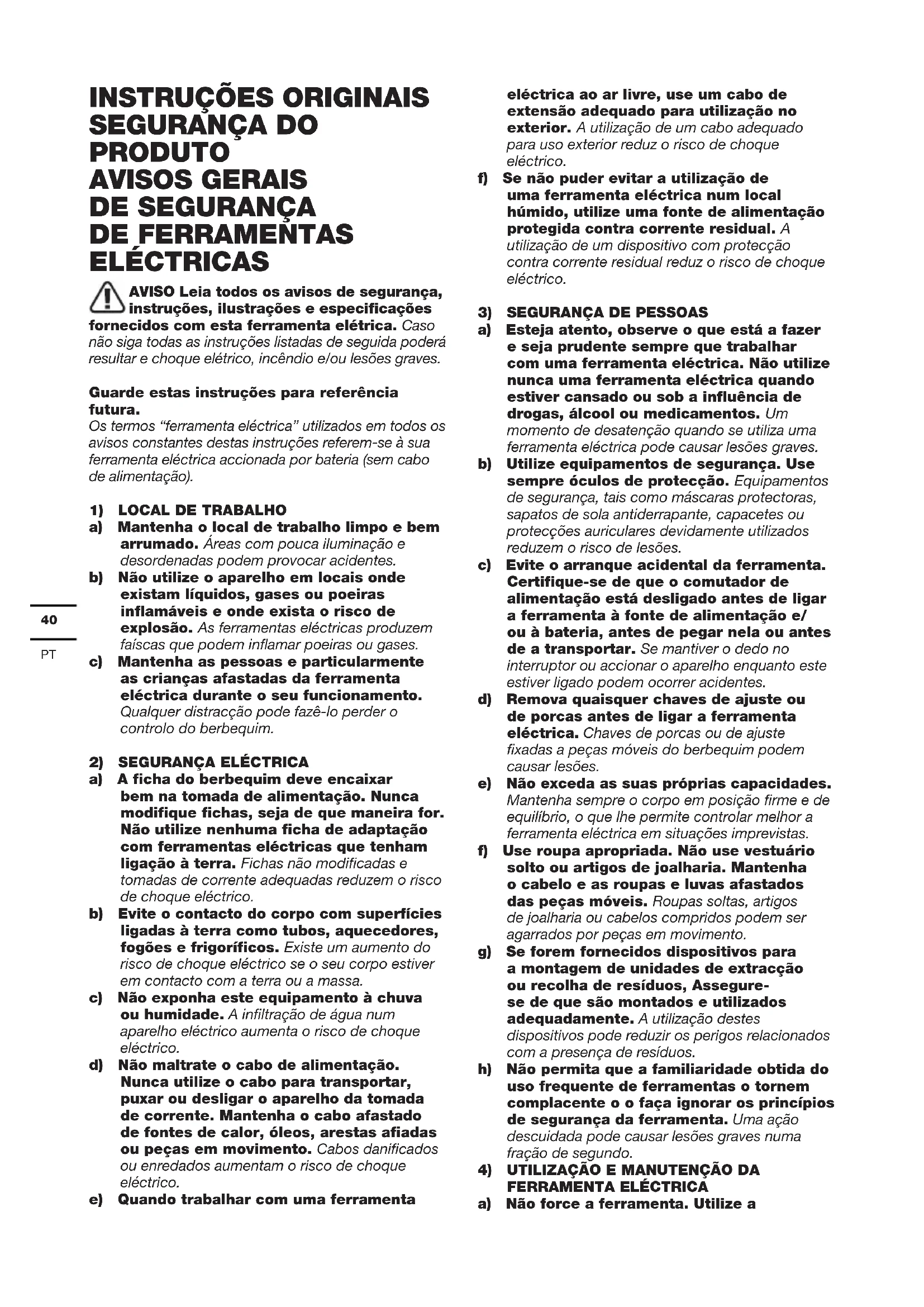a) A ficha do berbequim deve encaixar bem na tomada de alimentação. Nunca modifique fichas, seja de que maneira for. Não utilize nenhuma ficha de adaptação com ferramentas eléctricas que tenham ligação à terra. Fichas não modificadas e tomadas de corrente adequadas reduzem o risco de choque eléctrico. b) Evite o contacto do corpo com superfícies ligadas à terra como tubos, aquecedores, fogões e frigoríficos. Existe um aumento do risco de choque eléctrico se o seu corpo estiver em contacto com a terra ou a massa. c) Não exponha este equipamento à chuva ou humidade. A infiltração de água num aparelho eléctrico aumenta o risco de choque eléctrico. d) Não maltrate o cabo de alimentação. Nunca utilize o cabo para transportar, puxar ou desligar o aparelho da tomada de corrente. Mantenha o cabo afastado de fontes de calor, óleos, arestas afiadas ou peças em movimento. Cabos danificados ou enredados aumentam o risco de choque eléctrico. e) Quando trabalhar com uma ferramenta eléctrica ao ar livre, use um cabo de extensão adequado para utilização no exterior. A utilização de um cabo adequado para uso exterior reduz o risco de choque eléctrico. f) Se não puder evitar a utilização de uma ferramenta eléctrica num local húmido, utilize uma fonte de alimentação protegida contra corrente residual. A utilização de um dispositivo com protecção contra corrente residual reduz o risco de choque eléctrico.