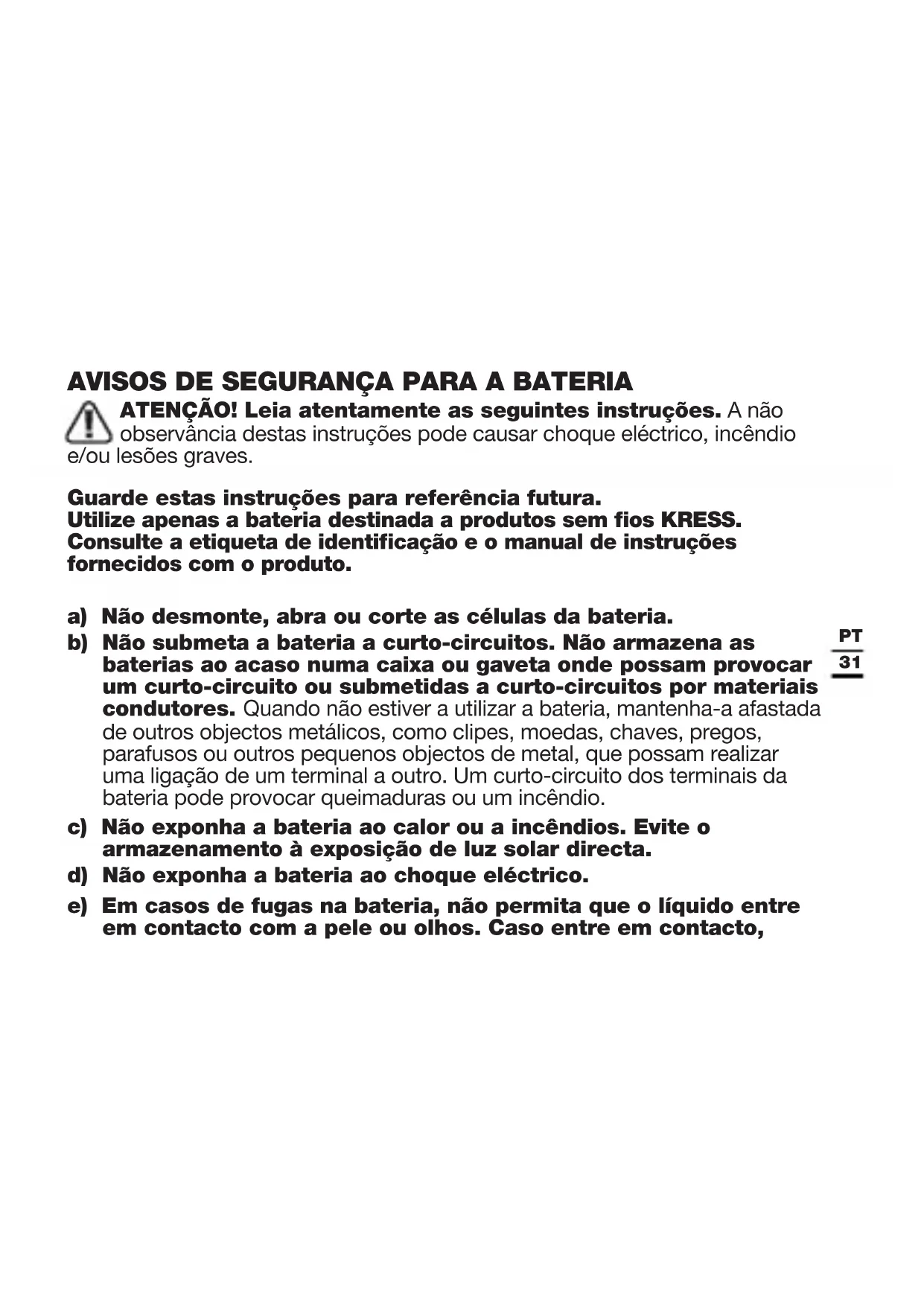 AVISOS DE SEGURANÇA PARA A BATERIA ATENÇÃO! Leia atentamente as seguintes instruções. A não observância destas instruções pode causar choque eléctrico, incêndio e/ou lesões graves. Guarde estas instruções para referência futura. Utilize apenas a bateria destinada a produtos sem fios KRESS. Consulte a etiqueta de identificação e o manual de instruções fornecidos com o produto. a) Não desmonte, abra ou corte as células da bateria. b) Não submeta a bateria a curto-circuitos. Não armazena as baterias ao acaso numa caixa ou gaveta onde possam provocar um curto-circuito ou submetidas a curto-circuitos por materiais condutores. Quando não estiver a utilizar a bateria, mantenha-a afastada de outros objectos metálicos, como clipes, moedas, chaves, pregos, parafusos ou outros pequenos objectos de metal, que possam realizar uma ligação de um terminal a outro. Um curto-circuito dos terminais da bateria pode provocar queimaduras ou um incêndio. c) Não exponha a bateria ao calor ou a incêndios. Evite o armazenamento à exposição de luz solar directa. d) Não exponha a bateria ao choque eléctrico. e) Em casos de fugas na bateria, não permita que o líquido entre em contacto com a pele ou olhos. Caso entre em contacto,32
