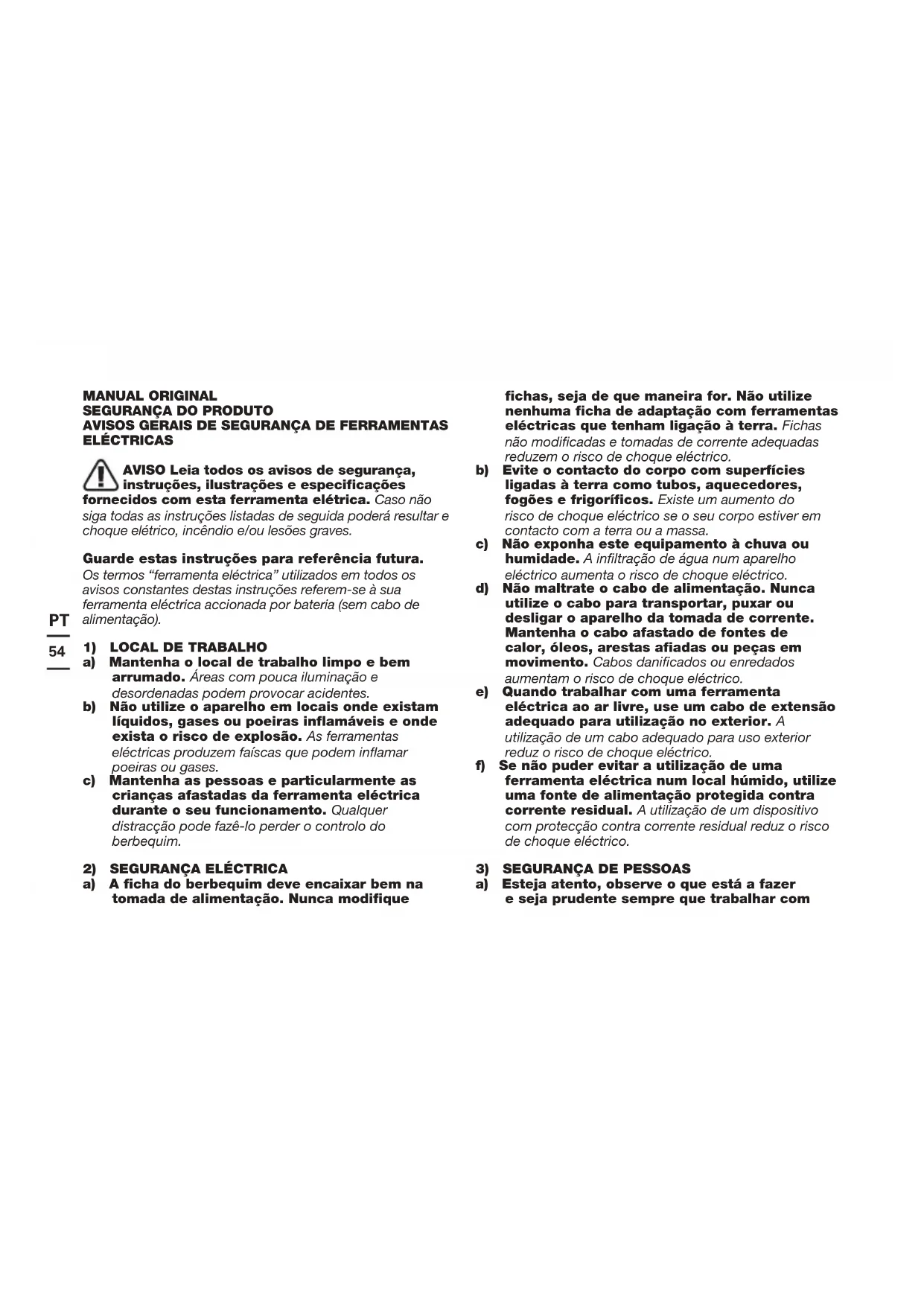 a) Mantenha o local de trabalho limpo e bem arrumado. Áreas com pouca iluminação e desordenadas podem provocar acidentes. b) Não utilize o aparelho em locais onde existam líquidos, gases ou poeiras inflamáveis e onde exista o risco de explosão. As ferramentas eléctricas produzem faíscas que podem inflamar poeiras ou gases. c) Mantenha as pessoas e particularmente as crianças afastadas da ferramenta eléctrica durante o seu funcionamento. Qualquer distracção pode fazê-lo perder o controlo do berbequim.