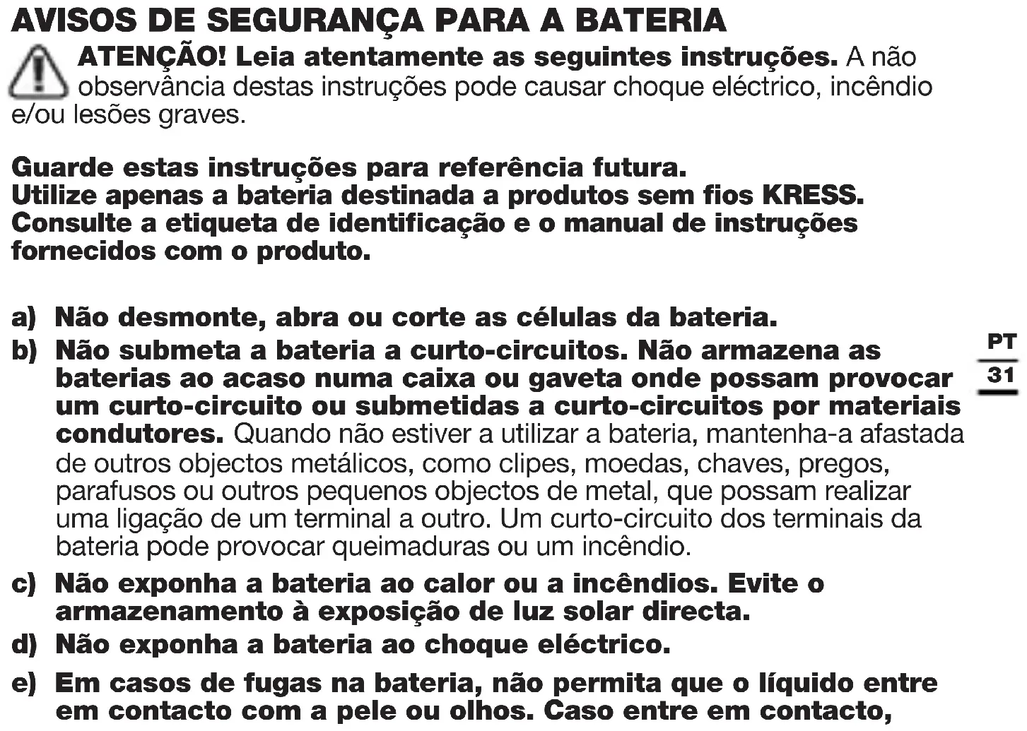 AVISOS DE SEGURANÇA PARA A BATERIA ATENÇÃO! Leia atentamente as seguintes instruções. A não observância destas instruções pode causar choque eléctrico, incêndio e/ou lesões graves. Guarde estas instruções para referência futura. Utilize apenas a bateria destinada a produtos sem fios KRESS. Consulte a etiqueta de identificação e o manual de instruções fornecidos com o produto. a) Não desmonte, abra ou corte as células da bateria. b) Não submeta a bateria a curto-circuitos. Não armazena as baterias ao acaso numa caixa ou gaveta onde possam provocar um curto-circuito ou submetidas a curto-circuitos por materiais condutores. Quando não estiver a utilizar a bateria, mantenha-a afastada de outros objectos metálicos, como clipes, moedas, chaves, pregos, parafusos ou outros pequenos objectos de metal, que possam realizar uma ligação de um terminal a outro. Um curto-circuito dos terminais da bateria pode provocar queimaduras ou um incêndio. c) Não exponha a bateria ao calor ou a incêndios. Evite o armazenamento à exposição de luz solar directa. d) Não exponha a bateria ao choque eléctrico. e) Em casos de fugas na bateria, não permita que o líquido entre em contacto com a pele ou olhos. Caso entre em contacto,32
