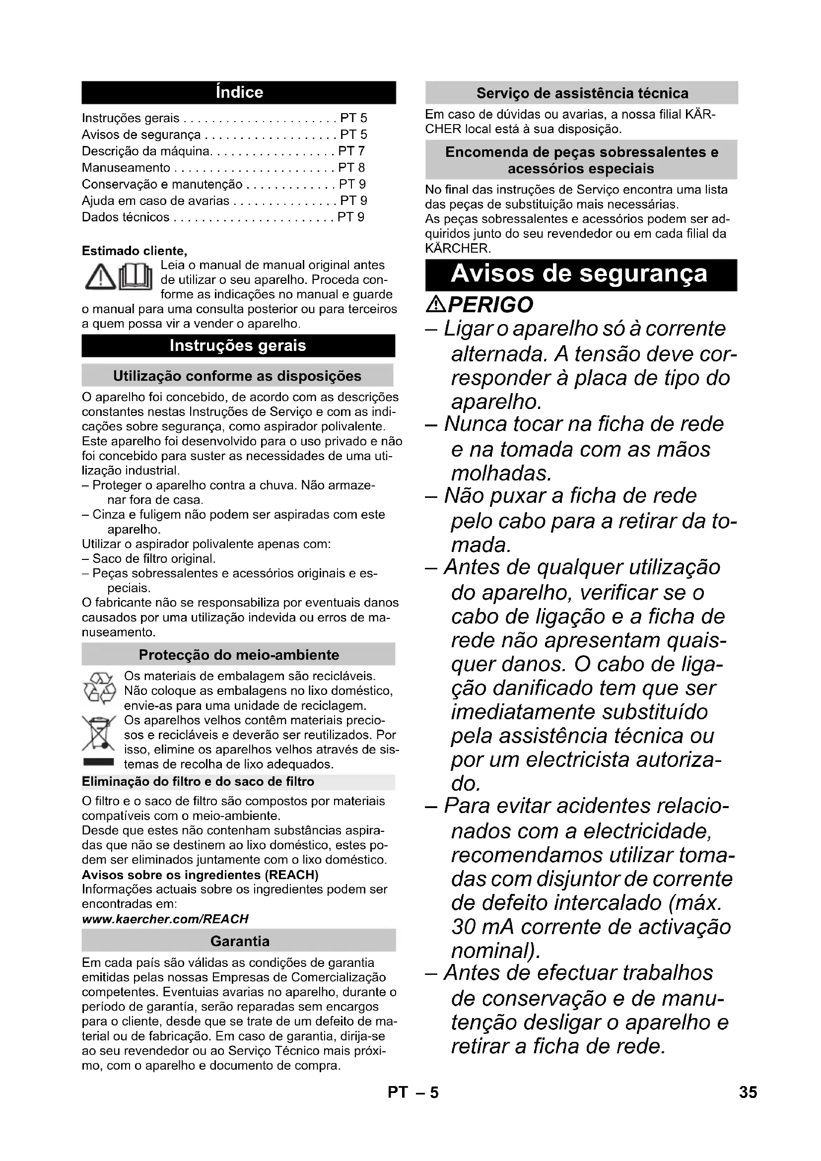 Cable de conexión a la red H 05VV-F2x0,75 Peso sin accesorios 5,5 kg Nivel de presión acústica (EN 60704-2-1) 75 dB(A) 34 ES– 5 Estimado cliente, Leia o manual de manual original antes de utilizar o seu aparelho. Proceda con- forme as indicações no manual e guarde o manual para uma consulta posterior ou para terceiros a quem possa vir a vender o aparelho. O aparelho foi concebido, de acordo com as descrições constantes nestas Instruções de Serviço e com as indi- cações sobre segurança, como aspirador polivalente. Este aparelho foi desenvolvido para o uso privado e não foi concebido para suster as necessidades de uma uti- lização industrial. – Proteger o aparelho contra a chuva. Não armaze- nar fora de casa. – Cinza e fuligem não podem ser aspiradas com este aparelho. Utilizar o aspirador polivalente apenas com: – Saco de filtro original. – Peças sobressalentes e acessórios originais e es- peciais. O fabricante não se responsabiliza por eventuais danos causados por uma utilização indevida ou erros de ma- nuseamento. Os materiais de embalagem são recicláveis. Não coloque as embalagens no lixo doméstico, envie-as para uma unidade de reciclagem. Os aparelhos velhos contêm materiais precio- sos e recicláveis e deverão ser reutilizados. Por isso, elimine os aparelhos velhos através de sis- temas de recolha de lixo adequados. O filtro e o saco de filtro são compostos por materiais compatíveis com o meio-ambiente. Desde que estes não contenham substâncias aspira- das que não se destinem ao lixo doméstico, estes po- dem ser eliminados juntamente com o lixo doméstico. Avisos sobre os ingredientes (REACH) Informações actuais sobre os ingredientes podem ser encontradas em: www.kaercher.com/REACH Em cada país são válidas as condições de garantia emitidas pelas nossas Empresas de Comercialização competentes. Eventuias avarias no aparelho, durante o período de garantía, serão reparadas sem encargos para o cliente, desde que se trate de um defeito de ma- terial ou de fabricação. Em caso de garantia, dirija-se ao seu revendedor ou ao Serviço Técnico mais próxi- mo, com o aparelho e documento de compra. Em caso de dúvidas ou avarias, a nossa filial KÄR- CHER local está à sua disposição. No final das instruções de Serviço encontra uma lista das peças de substituição mais necessárias. As peças sobressalentes e acessórios podem ser ad- quiridos junto do seu revendedor ou em cada filial da KÄRCHER. PERIGO – Ligar o aparelho só à corrente alternada. A tensão deve cor- responder à placa de tipo do aparelho. – Nunca tocar na ficha de rede e na tomada com as mãos molhadas. – Não puxar a ficha de rede pelo cabo para a retirar da to- mada. – Antes de qualquer utilização do aparelho, verificar se o cabo de ligação e a ficha de rede não apresentam quais- quer danos. O cabo de liga- ção danificado tem que ser imediatamente substituído pela assistência técnica ou por um electricista autoriza- do. – Para evitar acidentes relacio- nados com a electricidade, recomendamos utilizar toma- das com disjuntor de corrente de defeito intercalado (máx. 30 mA corrente de activação nominal). – Antes de efectuar trabalhos de conservação e de manu- tenção desligar o aparelho e retirar a ficha de rede. Índice Instruções gerais . . . . . . . . . . . . . . . . . . . . . . PT 5 Avisos de segurança . . . . . . . . . . . . . . . . . . . PT 5 Descrição da máquina. . . . . . . . . . . . . . . . . . PT 7 Manuseamento . . . . . . . . . . . . . . . . . . . . . . . PT 8 Conservação e manutenção . . . . . . . . . . . . . PT 9 Ajuda em caso de avarias . . . . . . . . . . . . . . . PT 9 Dados técnicos . . . . . . . . . . . . . . . . . . . . . . . PT 9 Instruções gerais Utilização conforme as disposições Protecção do meio-ambiente Eliminação do filtro e do saco de filtro Garantia Serviço de assistência técnica Encomenda de peças sobressalentes e acessórios especiais Avisos de segurança 35PT– 6 – Os trabalhos de reparação e trabalhos em componentes eléctricos só devem ser exe- cutados pelo Serviço de As- sistência Técnica autorizado. ATENÇÃO – Este aparelho não é adequado para a utilização por pessoas com capacidades físicas, sen- soriais e psíquicas reduzidas e por pessoas com falta de ex- periência e/ou conhecimentos, excepto se forem supervisio- nadas por uma pessoa res- ponsável pela segurança ou receberam instruções sobre o manuseamento do aparelho e que tenham percebido os peri- gos inerentes. – As crianças só estão autoriza- das a utilizar o aparelho se ti- verem uma idade superior a 8 anos e se forem supervisiona- das por uma pessoa responsá- vel pela segurança ou se rece- berem, por essa pessoa, ins- truções de utilização do apare- lho e que tenham percebido os perigos inerentes. – Crianças não podem brincar com o aparelho. – Supervisionar as crianças, de modo a assegurar que não brincam com o aparelho. – A limpeza e manutenção de aplicação não podem ser rea- lizadas por crianças sem uma vigilância adequada. – Manter as películas da emba- lagem fora do alcance das crianças! Perigo de asfixia! – Desligar o aparelho após cada utilização e antes de cada limpeza/manutenção. – Perigo de incêndio. Não aspi- rar materiais em combustão nem em brasa. – É proibido pôr o aparelho em funcionamento em áreas com perigo de explosão. – Desligar imediatamente o aparelho em caso de forma- ção de espuma ou de saída de líquido ou tirar a ficha da tomada! – Não utilize produtos abrasi- vos, produtos para a limpeza de vidros ou universais! Nun- ca mergulhe o aparelho em água. Determinadas substâncias po- dem, com o ar aspirado, formar gáses explosivos ou misturas por meio de turbulências! Nunca aspire as seguintes substâncias: – Gases, líquidos e pós (pó reac- tivo) explosivos ou inflamáveis – Pós reactivos de metal (p. ex. a