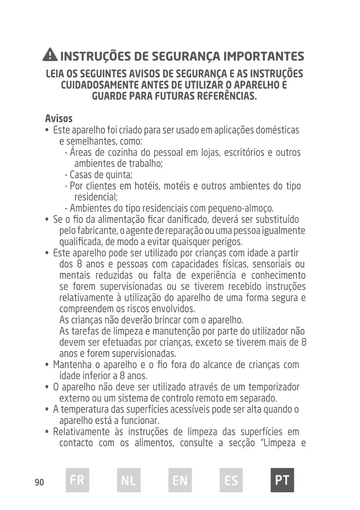 - Este aparelho pode ser utilizado por crianças com idade a partir dos 8 anos e pessoas com capacidades físicas, sensoriais ou mentais reduzidas ou falta de experiência e conhecimento se forem supervisionadas ou se tiverem recebido instruções relativamente à utilização do aparelho de uma forma segura e compreendem os riscos envolvidos. As crianças não deverão brincar com o aparelho. As tarefas de limpeza e manutenção por parte do utilizador não devem ser efetuadas por crianças, exceto se tiverem mais de 8 anos e forem supervisionadas.