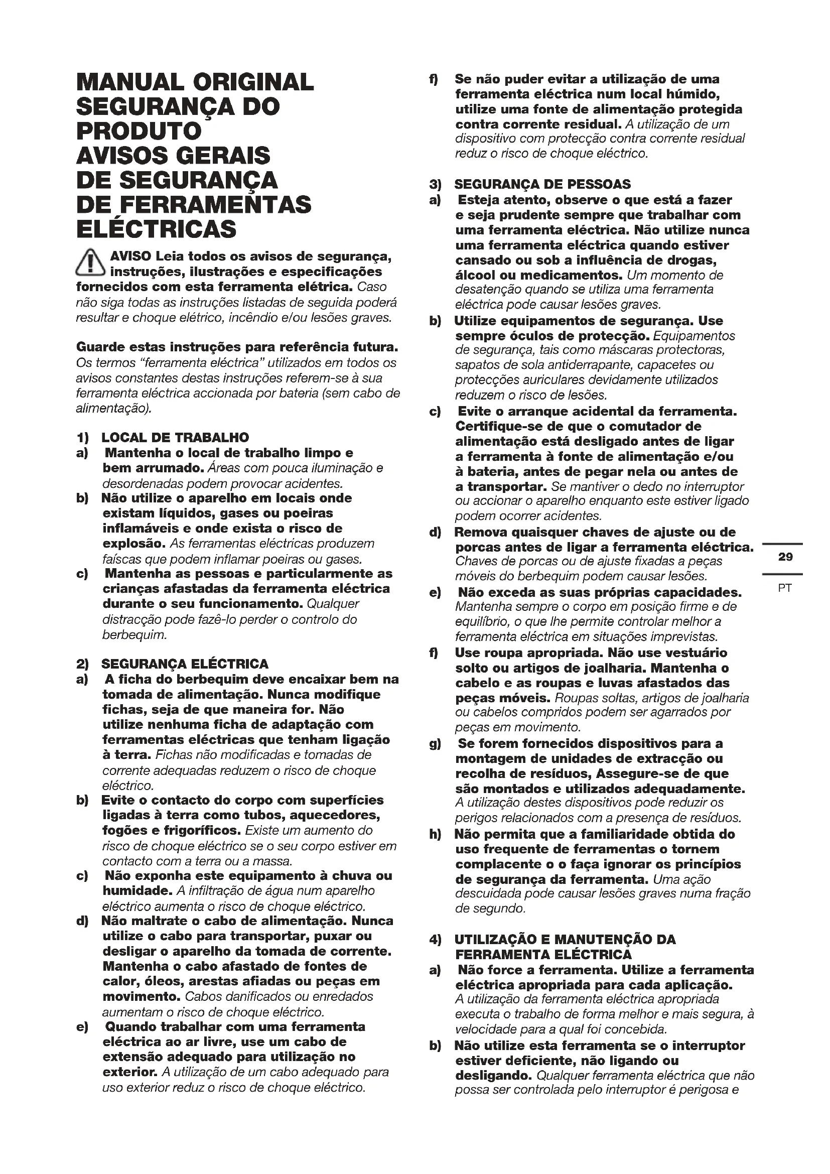 a) Esteja atento, observe o que está a fazer e seja prudente sempre que trabalhar com uma ferramenta eléctrica. Não utilize nunca uma ferramenta eléctrica quando estiver cansado ou sob a influência de drogas, álcool ou medicamentos. Um momento de desatenção quando se utiliza uma ferramenta eléctrica pode causar lesões graves. b) Utilize equipamentos de segurança. Use sempre óculos de protecção. Equipamentos de segurança, tais como máscaras protectoras, sapatos de sola antiderrapante, capacetes ou protecções auriculares devidamente utilizados reduzem o risco de lesões. c) Evite o arranque acidental da ferramenta. Certifique-se de que o comutador de alimentação está desligado antes de ligar a ferramenta à fonte de alimentação e/ou à bateria, antes de pegar nela ou antes de a transportar. Se mantiver o dedo no interruptor ou accionar o aparelho enquanto este estiver ligado podem ocorrer acidentes. d) Remova quaisquer chaves de ajuste ou de porcas antes de ligar a ferramenta eléctrica. Chaves de porcas ou de ajuste fixadas a peças móveis do berbequim podem causar lesões. e) Não exceda as suas próprias capacidades. Mantenha sempre o corpo em posição firme e de equilíbrio, o que lhe permite controlar melhor a ferramenta eléctrica em situações imprevistas. f) Use roupa apropriada. Não use vestuário solto ou artigos de joalharia. Mantenha o cabelo e as roupas e luvas afastados das peças móveis. Roupas soltas, artigos de joalharia ou cabelos compridos podem ser agarrados por peças em movimento. g) Se forem fornecidos dispositivos para a montagem de unidades de extracção ou recolha de resíduos, Assegure-se de que são montados e utilizados adequadamente. A utilização destes dispositivos pode reduzir os perigos relacionados com a presença de resíduos. h) Não permita que a familiaridade obtida do uso frequente de ferramentas o tornem complacente o o faça ignorar os princípios de segurança da ferramenta. Uma ação descuidada pode causar lesões graves numa fração de segundo.