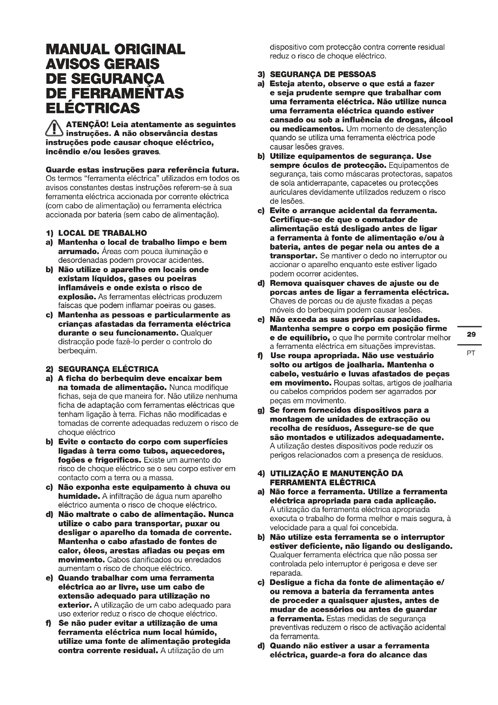 DE FERRAMENTAS ELÉCTRICAS ATENÇÃO! Leia atentamente as seguintes instruções. A não observância destas instruções pode causar choque eléctrico, incêndio e/ou lesões graves. Guarde estas instruções para referência futura. Os termos “ferramenta eléctrica” utilizados em todos os avisos constantes destas instruções referem-se à sua ferramenta eléctrica accionada por corrente eléctrica (com cabo de alimentação) ou ferramenta eléctrica accionada por bateria (sem cabo de alimentação).