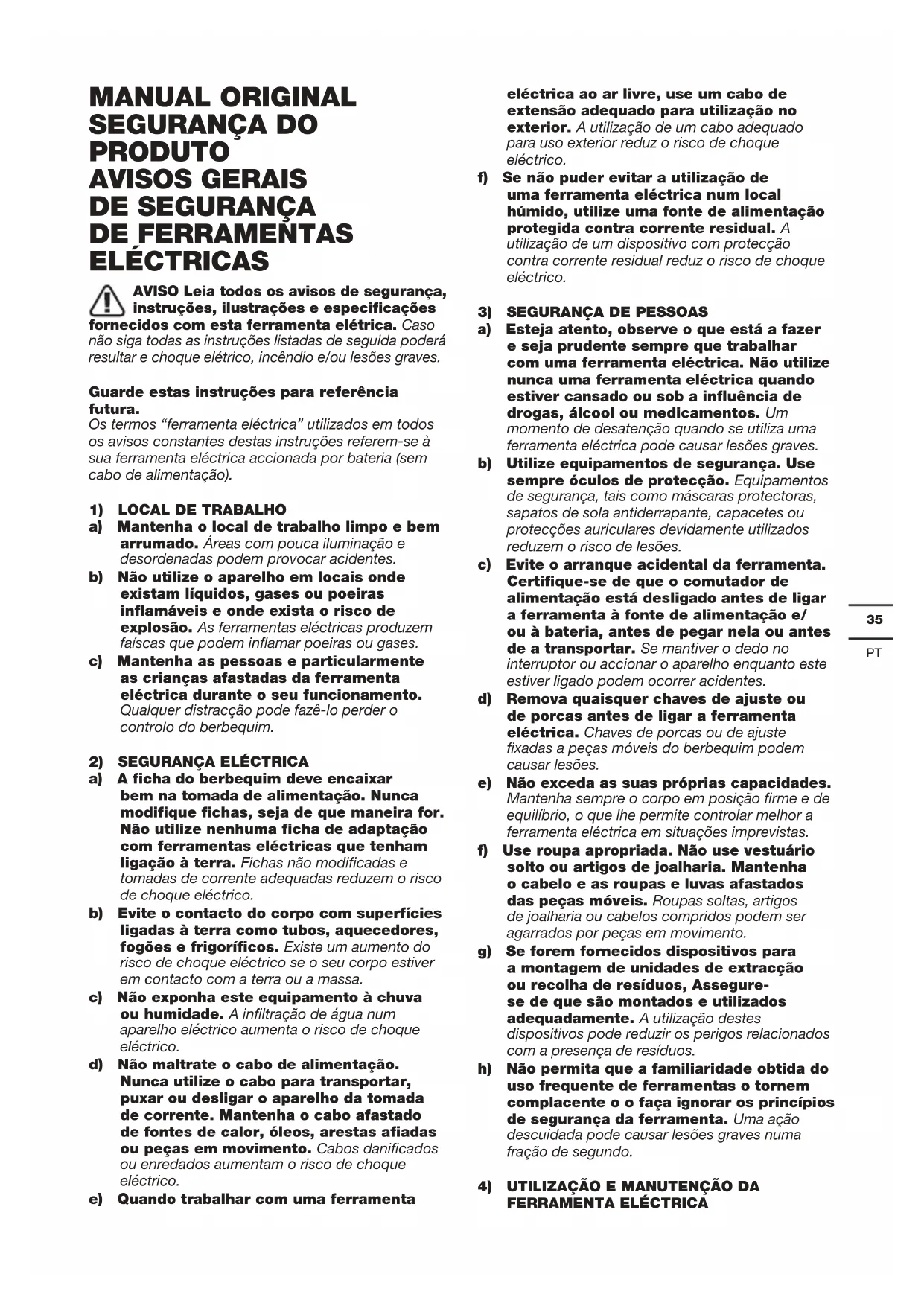 DE FERRAMENTAS ELÉCTRICAS AVISO Leia todos os avisos de segurança, instruções, ilustrações e especificações fornecidos com esta ferramenta elétrica. Caso não siga todas as instruções listadas de seguida poderá resultar e choque elétrico, incêndio e/ou lesões graves. Guarde estas instruções para referência futura. Os termos “ferramenta eléctrica” utilizados em todos os avisos constantes destas instruções referem-se à sua ferramenta eléctrica accionada por bateria (sem cabo de alimentação).
