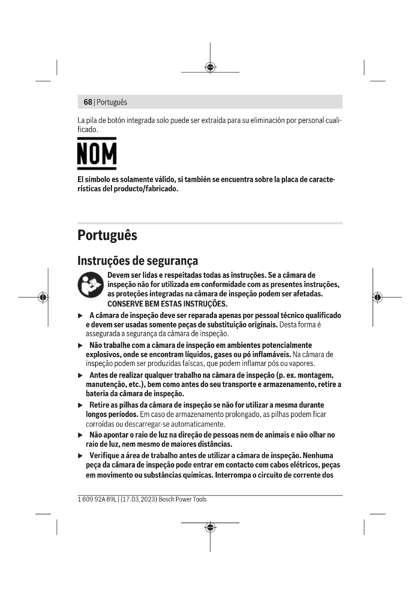 Borre archivos de la tarjeta Micro-SD(20). Error en la tarjeta Mi- cro-SD Retire la tarjeta Micro-SD(20) e insértela de nuevo. Compruebe la tarjeta Micro-SD en otro disposi- tivo. Bosch Power Tools 1 609 92A 89L | (17.03.2023)66 | Español Mantenimiento y servicio Mantenimiento y limpieza No sumerja el aparato portátil(13) en agua ni en otros líquidos. Mantenga limpia la cámara de inspección. Limpie la cámara de inspección y todos los medios auxiliares con especial esmero después de trabajar en zonas con sustancias noci- vas. Limpiar el aparato con un paño húmedo y suave. No utilice ningún detergente o disolven- te. En particular, limpie el lente de la cámara(4) con regularidad, prestando especial aten- ción a las pelusas. Sustituir la pila de botón integrada La sustitución de la pila de botón debe ser realizada por Bosch o por el servicio técnico autorizado para herramientas eléctricas de Bosch. u Atención: Sustituya siempre una pila en forma de botón por otra del mismo tipo. Existe el riesgo de explosión. u Retire y deseche las pilas en forma de botón debidamente. Las pilas en forma de botón descargadas pueden tener fugas y por ello dañar el producto o lesionar perso- nas. Servicio técnico y atención al cliente El servicio técnico le asesorará en las consultas que pueda Ud. tener sobre la reparación y mantenimiento de su producto, así como sobre piezas de recambio. Las representacio- nes gráficas tridimensionales e informaciones de repuestos se encuentran también bajo: www.bosch-pt.com El equipo asesor de aplicaciones de Bosch le ayuda gustosamente en caso de preguntas sobre nuestros productos y sus accesorios. Para cualquier consulta o pedido de piezas de repuesto es imprescindible indicar el nº de artículo de 10dígitos que figura en la placa de características del producto. España Robert Bosch España S.L.U. Departamento de ventas Herramientas Eléctricas C/Hermanos García Noblejas, 19 28037 Madrid Para efectuar su pedido online de recambios o pedir la recogida para la reparación de su máquina, entre en la página www.herramientasbosch.net. 1 609 92A 89L | (17.03.2023) Bosch Power ToolsEspañol | 67 Tel. Asesoramiento al cliente: 902 531 553 Fax: 902 531554 Direcciones de servicio adicionales se encuentran bajo: www.bosch-pt.com/serviceaddresses Transporte Los acumuladores de iones de litio recomendados están sujetos a los requerimientos de la ley de mercancías peligrosas. Los acumuladores pueden ser transportados por carre- tera por el usuario sin más imposiciones. En el envío por terceros (p.ej., transporte aéreo o por agencia de transportes) deberán considerarse las exigencias especiales en cuanto a su embalaje e identificación. En este caso deberá recurrirse a los servicios de un experto en mercancías peligrosas al preparar la pieza para su envío. Únicamente envíe acumuladores si su carcasa no está dañada. Si los contactos no van protegidos cúbralos con cinta adhesiva y embale el acumulador de manera que éste no se pueda mover dentro del embalaje. Observe también las prescripciones adicionales que pudieran existir al respecto en su país. Eliminación La cámara de inspección, las pilas/los acumuladores, los accesorios y los embalajes deben reciclarse de forma respetuosa con el medio ambiente. ¡No elimine la cámara de inspección ni las pilas/los acumuladores con la basura doméstica! Sólo para los países de laUE: De acuerdo con las directivas europeas 2012/19/UE y 2006/66/CE, las cámaras de ins- pección que ya no son aptas para su uso y los acumuladores/las pilas defectuosos o vací- os deberán ser recogidos por separado y reciclados de manera respetuosa con el medio ambiente. En el caso de una eliminación inadecuada, los aparatos eléctricos y electrónicos pueden tener efectos nocivos para el medio ambiente y la salud humana debido a la posible pre- sencia de sustancias peligrosas. Acumuladores/pilas: Iones de Litio: Por favor, observe las indicaciones en el apartado Transporte (ver "Transporte", Pági- na67). Bosch Power Tools 1 609 92A 89L | (17.03.2023)68 | Português La pila de botón integrada solo puede ser extraída para su eliminación por personal cuali- ficado. El símbolo es solamente válido, si también se encuentra sobre la placa de caracte- rísticas del producto/fabricado. Português Instruções de segurança Devem ser lidas e respeitadas todas as instruções. Se a câmara de inspeção não for utilizada em conformidade com as presentes instruções, as proteções integradas na câmara de inspeção podem ser afetadas. CONSERVE BEM ESTAS INSTRUÇÕES. u A câmara de inspeção deve ser reparada apenas por pessoal técnico qualificado e devem ser usadas somente peças de substituição originais. Desta forma é assegurada a segurança da câmara de inspeção. u Não trabalhe com a câmara de inspeção em ambientes potencialmente explosivos, onde se encontram líquidos, gases ou pó inflamáveis. Na câmara de inspeção podem ser produzidas faíscas, que podem inflamar pós ou vapores. u Antes de realizar qualquer trabalho na câmara de inspeção (p. ex. montagem, manutenção, etc.), bem como antes do seu transporte e armazenamento, retire a bateria da câmara de inspeção. u Retire as pilhas da câmara de inspeção se não for utilizar a mesma durante longos períodos. Em caso de armazenamento prolongado, as pilhas podem ficar corroídas ou descarregar-se automaticamente. u Não apontar o raio de luz na direção de pessoas nem de animais e não olhar no raio de luz, nem mesmo de maiores distâncias. u Verifique a área de trabalho antes de utilizar a câmara de inspeção. Nenhuma peça da câmara de inspeção pode entrar em contacto com cabos elétricos, peças em movimento ou substâncias químicas. Interrompa o circuito de corrente dos 1 609 92A 89L | (17.03.2023) Bosch Power ToolsPortuguês | 69 cabos elétricos que passam pela área de trabalho. Estas medidas reduzem o risco de e