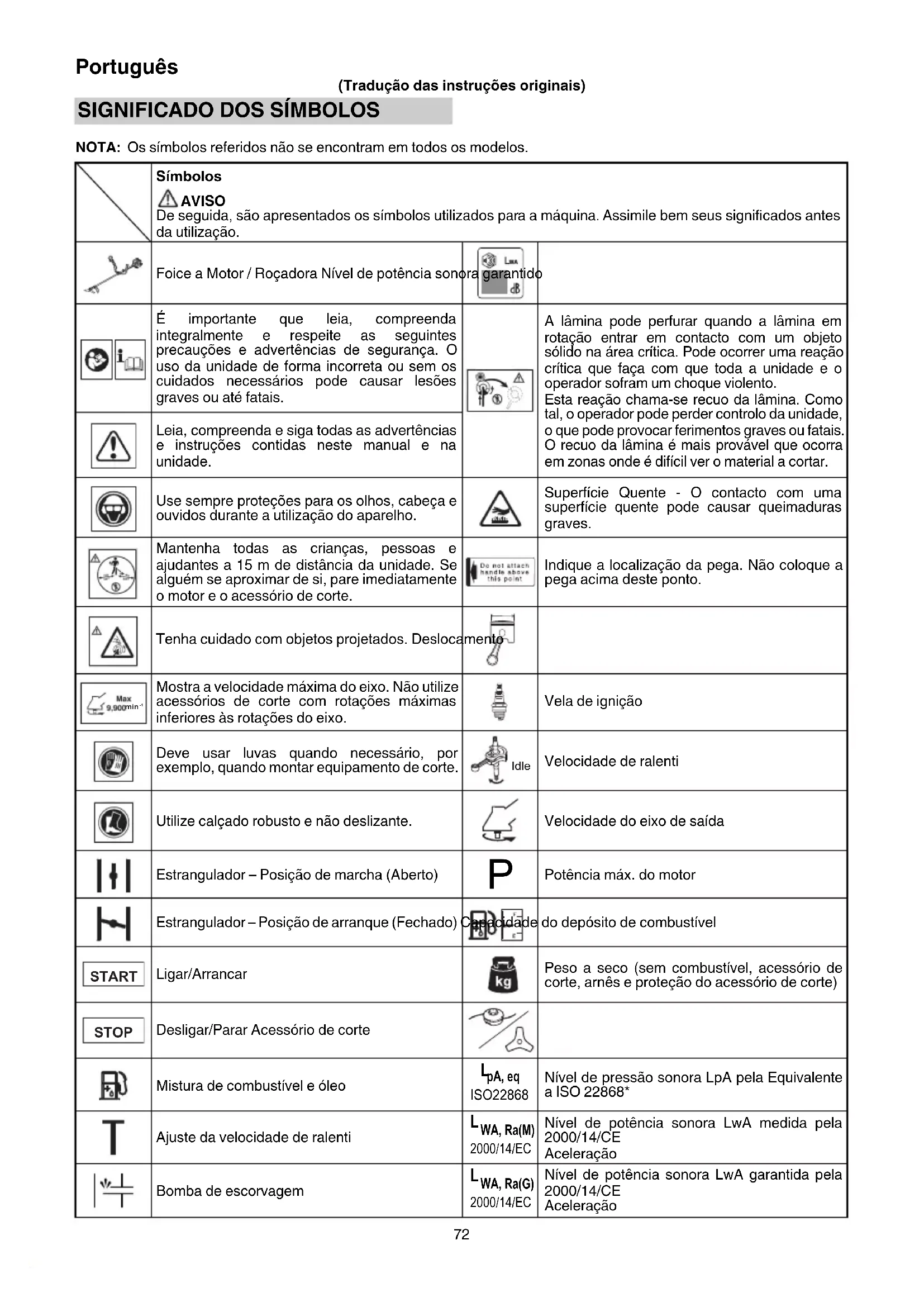 NOTA: Os símbolos referidos não se encontram em todos os modelos. Símbolos AVISO De seguida, são apresentados os símbolos utilizados para a máquina. Assimile bem seus signifi cados antes da utilização. Foice a Motor / Roçadora Nível de potência sonora garantido É importante que leia, compreenda integralmente e respeite as seguintes precauções e advertências de segurança. O uso da unidade de forma incorreta ou sem os cuidados necessários pode causar lesões graves ou até fatais. A lâmina pode perfurar quando a lâmina em rotação entrar em contacto com um objeto sólido na área crítica. Pode ocorrer uma reação crítica que faça com que toda a unidade e o operador sofram um choque violento. Esta reação chama-se recuo da lâmina. Como tal, o operador pode perder controlo da unidade, o que pode provocar ferimentos graves ou fatais. O recuo da lâmina é mais provável que ocorra em zonas onde é difícil ver o material a cortar. Leia, compreenda e siga todas as advertências e instruções contidas neste manual e na unidade. Use sempre proteções para os olhos, cabeça e ouvidos durante a utilização do aparelho. Superfície Quente - O contacto com uma superfície quente pode causar queimaduras graves. Mantenha todas as crianças, pessoas e ajudantes a 15 m de distância da unidade. Se alguém se aproximar de si, pare imediatamente o motor e o acessório de corte. Indique a localização da pega. Não coloque a pega acima deste ponto. Tenha cuidado com objetos projetados. Deslocamento min