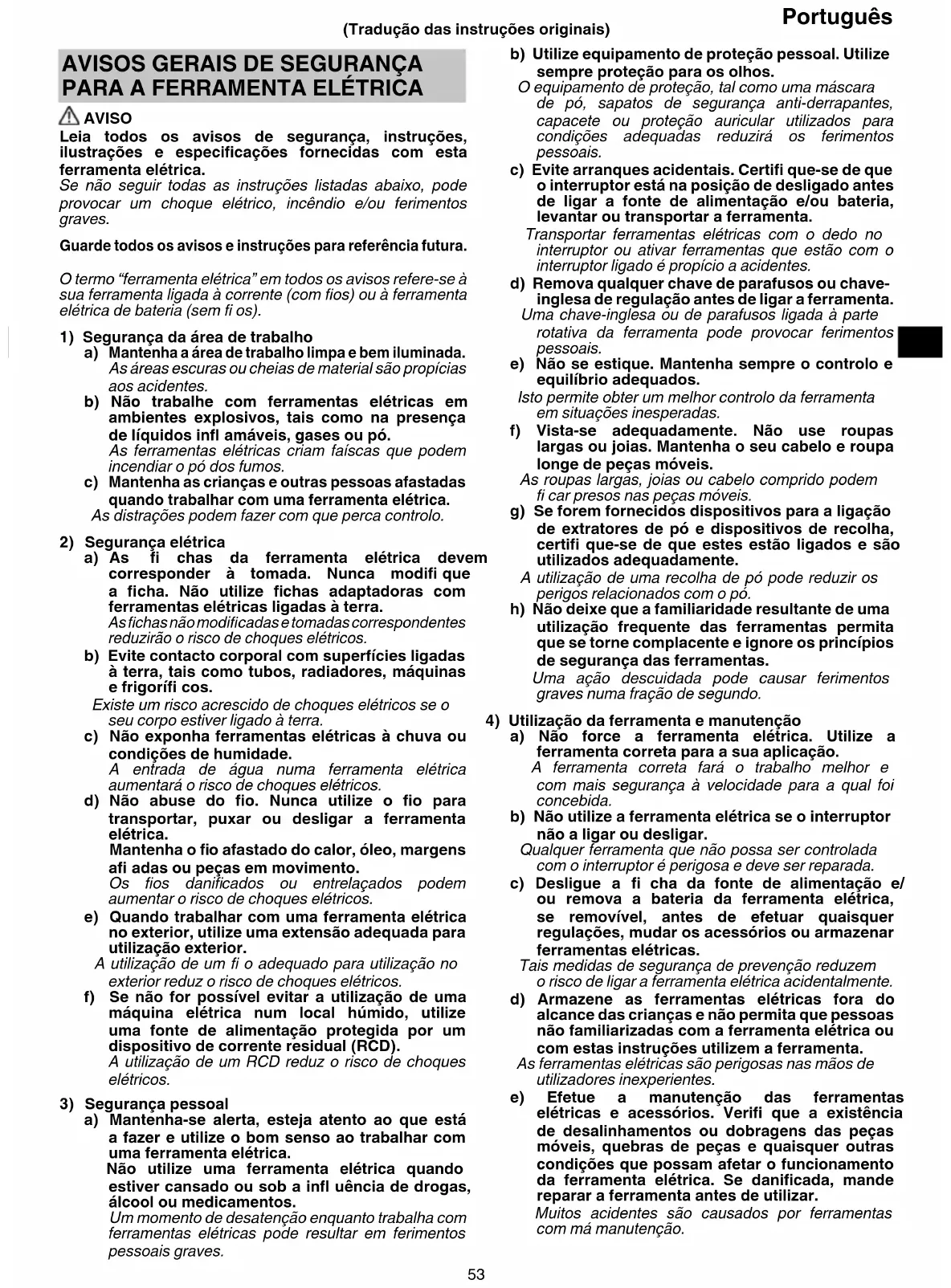 a) Mantenha-se alerta, esteja atento ao que está a fazer e utilize o bom senso ao trabalhar com uma ferramenta elétrica. Não utilize uma ferramenta elétrica quando estiver cansado ou sob a infl uência de drogas, álcool ou medicamentos. Um momento de desatenção enquanto trabalha com ferramentas elétricas pode resultar em ferimentos pessoais graves. (Tradução das instruções originais) 0000BookCV12DA.indb530000BookCV12DA.indb53 2019/12/1612:36:552019/12/1612:36:5554 Português f) Mantenha as ferramentas de corte afi adas e limpas. As ferramentas de corte com uma manutenção adequada e extremidades afi adas são menos propensas a dobrar e mais fáceis de controlar.