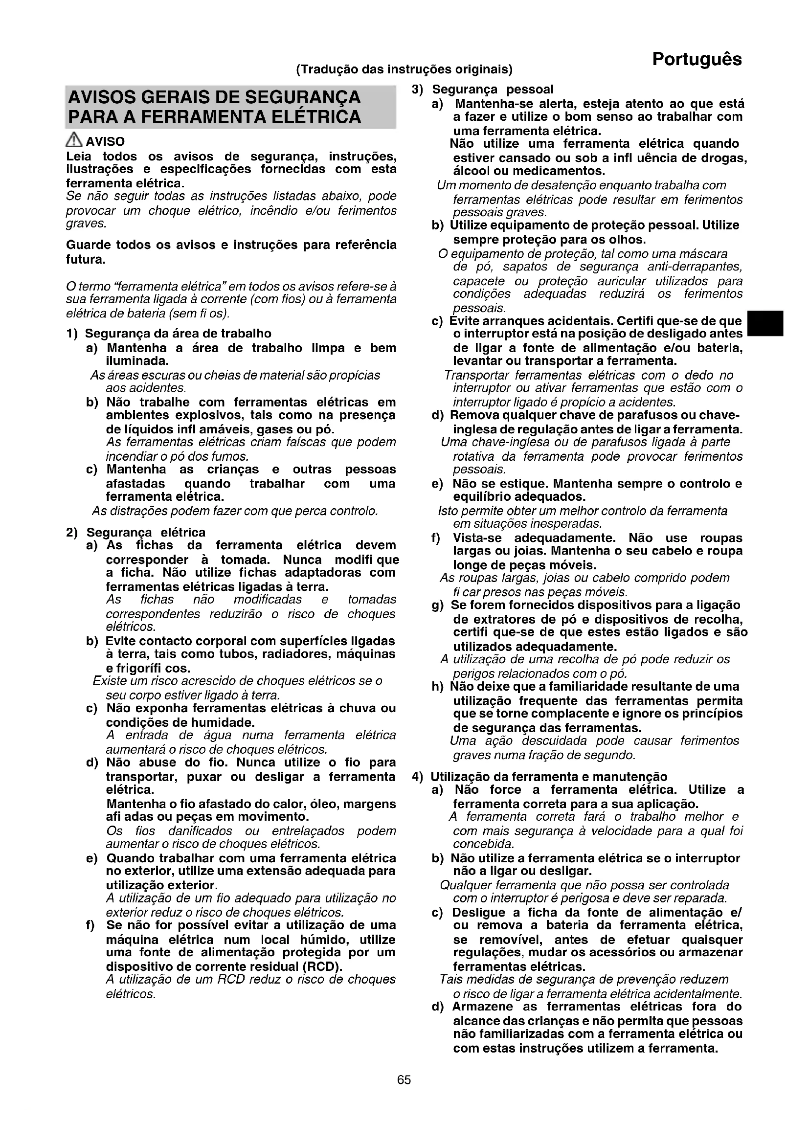 a) Use proteções auditivas A exposição ao ruído pode causar perda auditiva. b) Utilize a(s) pega(s) auxiliar(es), se fornecida(s) com a ferramenta. A perda de controlo pode causar ferimentos pessoais. c) Segure na ferramenta pelas superfícies isoladas, quando efectuar uma operação em que o acessório de corte possa entrar em contacto com cabos ocultos. O acessório cortante em contacto com um fi o sob tensão pode colocar as peças metálicas expostas sob tensão e provocar choques elétricos ao operador.