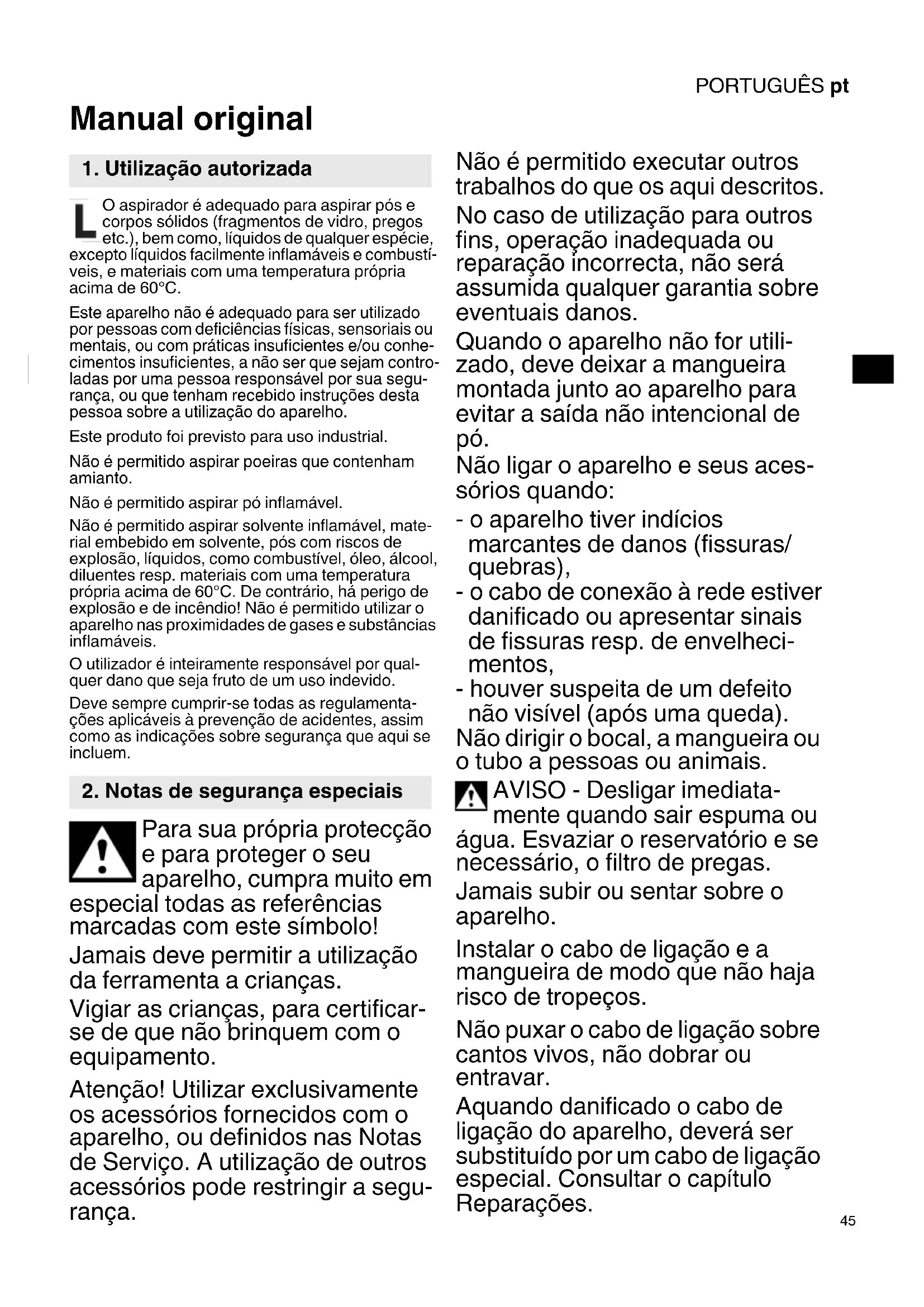 Manual original O aspirador é adequado para aspirar pós e corpos sólidos (fragmentos de vidro, pregos etc.), bem como, líquidos de qualquer espécie, excepto líquidos facilmente inflamáveis e combustí- veis, e materiais com uma temperatura própria acima de 60°C. Este aparelho não é adequado para ser utilizado por pessoas com deficiências físicas, sensoriais ou mentais, ou com práticas insuficientes e/ou conhe- cimentos insuficientes, a não ser que sejam contro- ladas por uma pessoa responsável por sua segu- rança, ou que tenham recebido instruções desta pessoa sobre a utilização do aparelho. Este produto foi previsto para uso industrial. Não é permitido aspirar poeiras que contenham amianto. Não é permitido aspirar pó inflamável. Não é permitido aspirar solvente inflamável, mate- rial embebido em solvente, pós com riscos de explosão, líquidos, como combustível, óleo, álcool, diluentes resp. materiais com uma temperatura própria acima de 60°C. De contrário, há perigo de explosão e de incêndio! Não é permitido utilizar o aparelho nas proximidades de gases e substâncias inflamáveis. O utilizador é inteiramente responsável por qual- quer dano que seja fruto de um uso indevido. Deve sempre cumprir-se todas as regulamenta- ções aplicáveis à prevenção de acidentes, assim como as indicações sobre segurança que aqui se incluem. Para sua própria protecção e para proteger o seu aparelho, cumpra muito em especial todas as referências marcadas com este símbolo! Jamais deve permitir a utilização da ferramenta a crianças. Vigiar as crianças, para certificar- se de que não brinquem com o equipamento. Atenção! Utilizar exclusivamente os acessórios fornecidos com o aparelho, ou definidos nas Notas de Serviço. A utilização de outros acessórios pode restringir a segu- rança. Não é permitido executar outros trabalhos do que os aqui descritos. No caso de utilização para outros fins, operação inadequada ou reparação incorrecta, não será assumida qualquer garantia sobre eventuais danos. Quando o aparelho não for utili- zado, deve deixar a mangueira montada junto ao aparelho para evitar a saída não intencional de pó. Não ligar o aparelho e seus aces- sórios quando: - o aparelho tiver indícios marcantes de danos (fissuras/ quebras), - o cabo de conexão à rede estiver danificado ou apresentar sinais de fissuras resp. de envelheci- mentos, - houver suspeita de um defeito não visível (após uma queda). Não dirigir o bocal, a mangueira ou o tubo a pessoas ou animais. AVISO - Desligar imediata- mente quando sair espuma ou água. Esvaziar o reservatório e se necessário, o filtro de pregas. Jamais subir ou sentar sobre o aparelho. Instalar o cabo de ligação e a mangueira de modo que não haja risco de tropeços. Não puxar o cabo de ligação sobre cantos vivos, não dobrar ou entravar. Aquando danificado o cabo de ligação do aparelho, deverá ser substituído por um cabo de ligação especial. Consultar o capítulo Reparações.