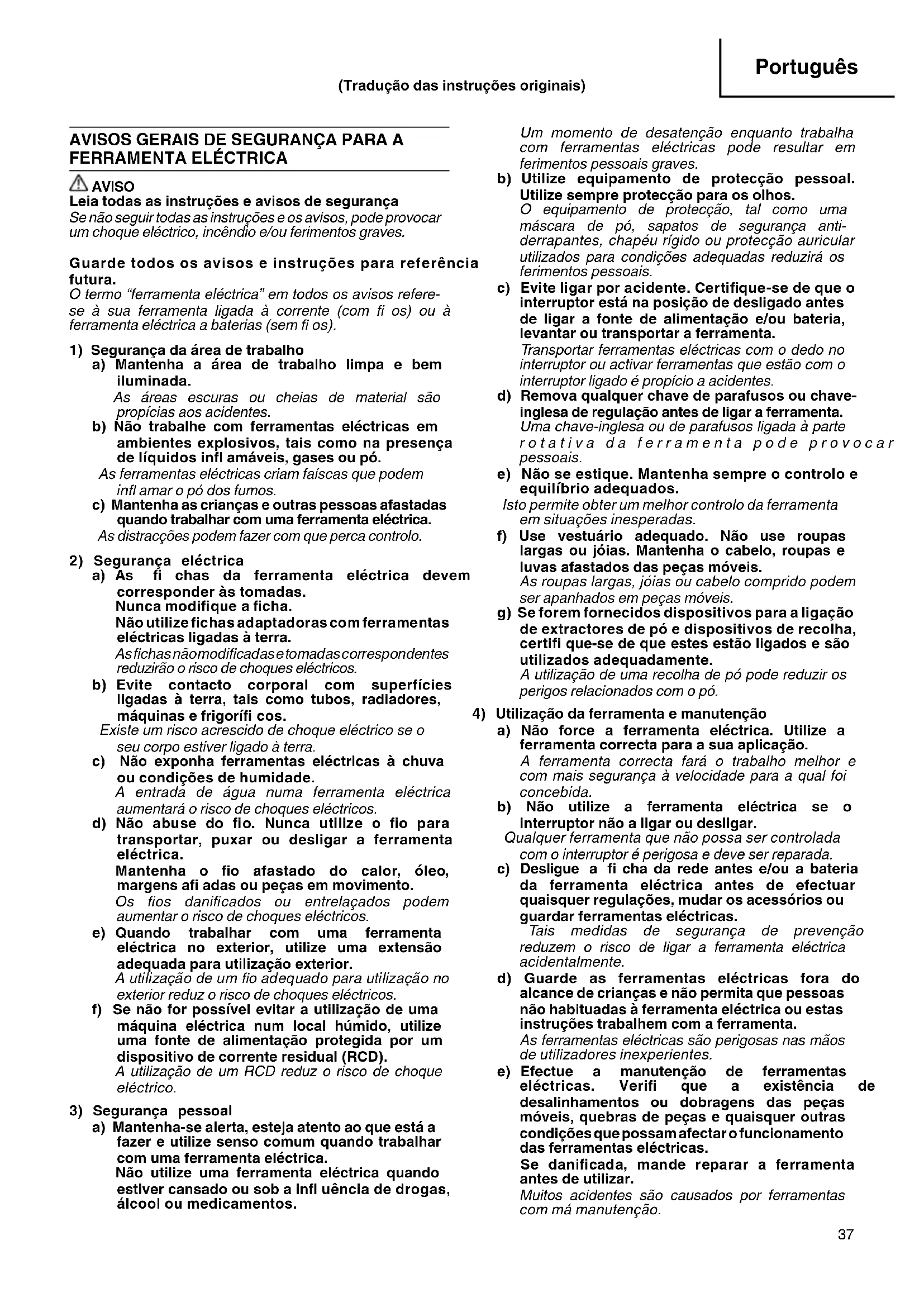 AVISO Leia todas as instruções e avisos de segurança Se não seguir todas as instruções e os avisos, pode provocar um choque eléctrico, incêndio e/ou ferimentos graves. Guarde todos os avisos e instruções para referência futura. O termo “ferramenta eléctrica” em todos os avisos refere- se à sua ferramenta ligada à corrente (com fi os) ou à ferramenta eléctrica a baterias (sem fi os).