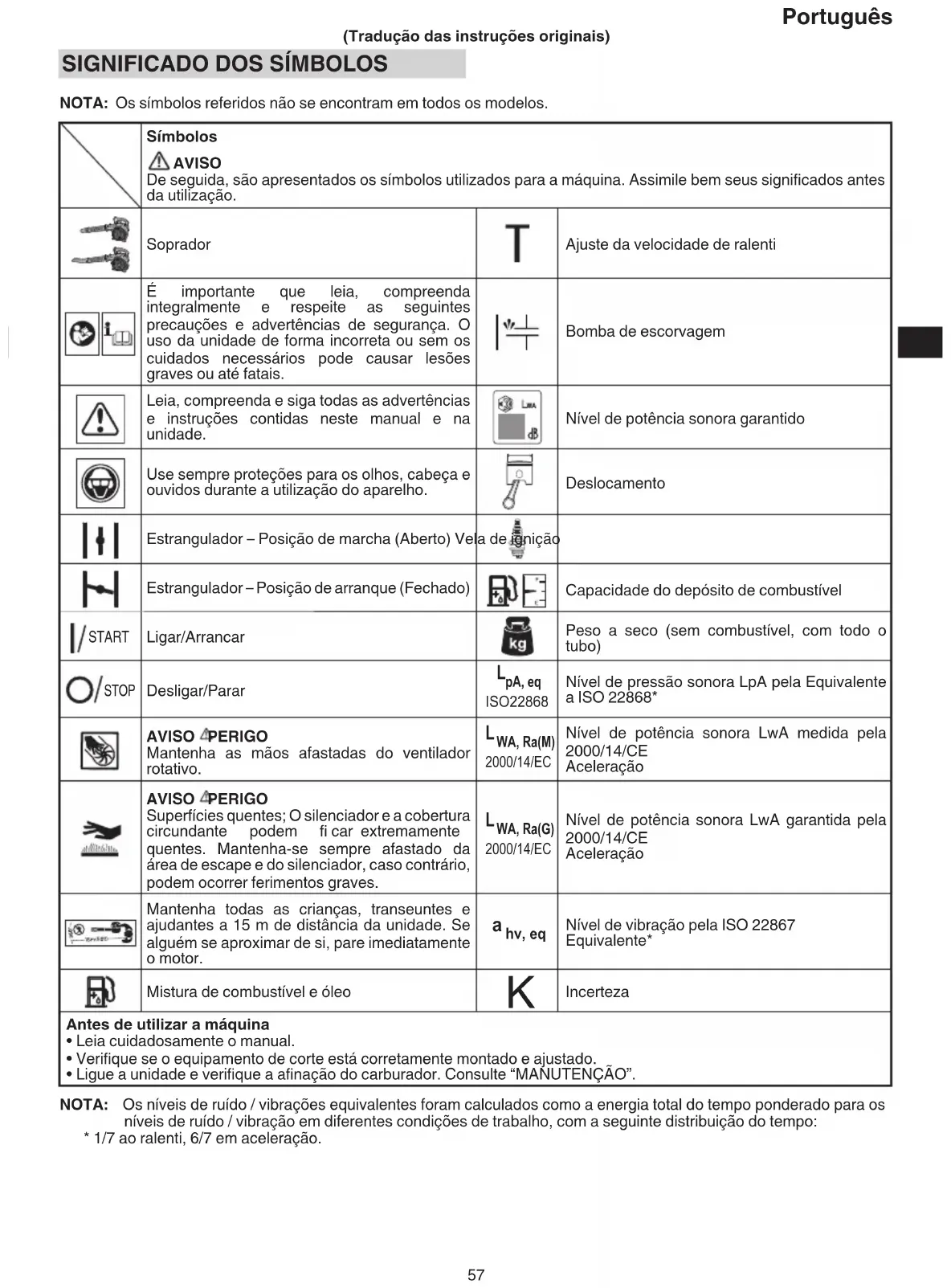 NOTA: Os símbolos referidos não se encontram em todos os modelos. Símbolos AVISO De seguida, são apresentados os símbolos utilizados para a máquina. Assimile bem seus signifi cados antes da utilização. Soprador Ajuste da velocidade de ralenti É importante que leia, compreenda integralmente e respeite as seguintes precauções e advertências de segurança. O uso da unidade de forma incorreta ou sem os cuidados necessários pode causar lesões graves ou até fatais. Bomba de escorvagem Leia, compreenda e siga todas as advertências e instruções contidas neste manual e na unidade. Nível de potência sonora garantido Use sempre proteções para os olhos, cabeça e ouvidos durante a utilização do aparelho. Deslocamento Estrangulador – Posição de marcha (Aberto) Vela de ignição Estrangulador – Posição de arranque (Fechado) Capacidade do depósito de combustível START Ligar/Arrancar Peso a seco (sem combustível, com todo o tubo) STOP Desligar/Parar