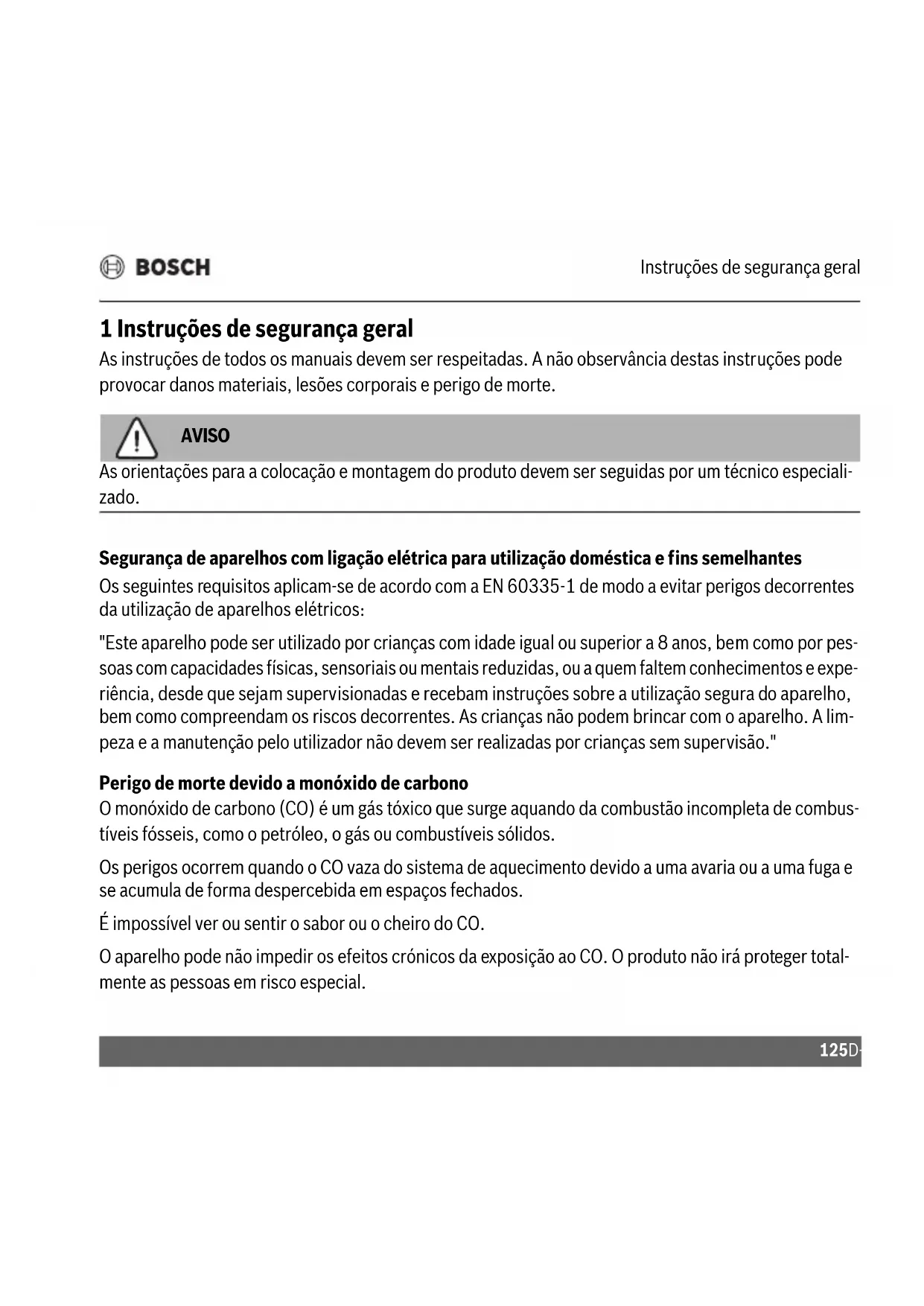 - Rys. 15: pamięć alarmów Opis symbolu Tab. 1 Opis symbolu Ostrzeżenie o tlenku węgla Wilgotność Pięcioletnia gwarancja Informacje Odpady elektryczne i zużyty sprzęt elektroniczny (WEE) — Dyrektywa europejska (2012/19/UE) Montaż Typ produktu Konserwacja Żywotność baterii Ostrzeżenie temperatura Zagrożenie życia xInstruções de segurança geral 125D-CO – 6721848329 (2022/02) 1 Instruções de segurança geral As instruções de todos os manuais devem ser respeitadas. A não observância destas instruções pode provocar danos materiais, lesões corporais e perigo de morte. AVISO As orientações para a colocação e montagem do produto devem ser seguidas por um técnico especiali- zado. Segurança de aparelhos com ligação elétrica para utilização doméstica e fins semelhantes Os seguintes requisitos aplicam-se de acordo com a EN 60335-1 de modo a evitar perigos decorrentes da utilização de aparelhos elétricos: "Este aparelho pode ser utilizado por crianças com idade igual ou superior a 8 anos, bem como por pes- soas com capacidades físicas, sensoriais ou mentais reduzidas, ou a quem faltem conhecimentos e expe- riência, desde que sejam supervisionadas e recebam instruções sobre a utilização segura do aparelho, bem como compreendam os riscos decorrentes. As crianças não podem brincar com o aparelho. A lim- peza e a manutenção pelo utilizador não devem ser realizadas por crianças sem supervisão." Perigo de morte devido a monóxido de carbono O monóxido de carbono (CO) é um gás tóxico que surge aquando da combustão incompleta de combus- tíveis fósseis, como o petróleo, o gás ou combustíveis sólidos. Os perigos ocorrem quando o CO vaza do sistema de aquecimento devido a uma avaria ou a uma fuga e se acumula de forma despercebida em espaços fechados. É impossível ver ou sentir o sabor ou o cheiro do CO. O aparelho pode não impedir os efeitos crónicos da exposição ao CO. O produto não irá proteger total- mente as pessoas em risco especial.Instruções de segurança geral D-CO – 6721848329 (2022/02)126 Solicitar regularmente a inspeção e a manutenção da instalação de aquecimento por uma empresa espe- cializada autorizada. AVISO A instalação do alarme não deve ser utilizada como substituição da instalação, utilização e manutenção adequadas de aparelhos de queima de combustível, incluindo para sistemas de ventilação e exaustão apropriados. O que fazer na presença de um alarme de monóxido de carbono ▶ Manter a calma e abrir todas as portas e janelas para aumentar a taxa de renovação de ar. ▶ Interromper a utilização de aparelhos de queima de combustível e assegurar, se possível, que estão desligados. Por exemplo, no caso de aparelhos a gás, isolar a válvula de controlo de emergência. ▶ Se o alarme permanecer ativado, abandonar o edifício e regressar apenas quando o alarme parar. No caso de propriedades multifamiliares ou de vários andares, alertar todos os ocupantes quanto ao risco. ▶ Obter assistência médica para qualquer pessoa que manifeste sintomas de envenenamento por monóxido de carbono e informar da suspeita de inalação de monóxido de carbono. ▶ Entrar em contacto com a agência competente de assistência e/ou manutenção. Quando necessário, entrar em contacto com o fornecedor de combustível através do seu número de emergência e com o prestador nacional de serviços de emergência relativos a gás. Deste modo, a fonte das emissões de monóxido de carbono pode ser identificada e corrigida. ▶Não utilize novamente os aparelhos de queima de combustível até que sejam verificados e aprovados por um técnico especializado de acordo com a regulamentação nacional.Informações sobre o produto 127D-CO – 6721848329 (2022/02) AVISO Perigo de morte! Caso se pondere silenciar aparelho, estar ciente do facto de que o alarme foi ativado devido a níveis peri- gosos de monóxido de carbono e que é perigoso permanecer no ambiente do aparelho. 2 Informações sobre o produto