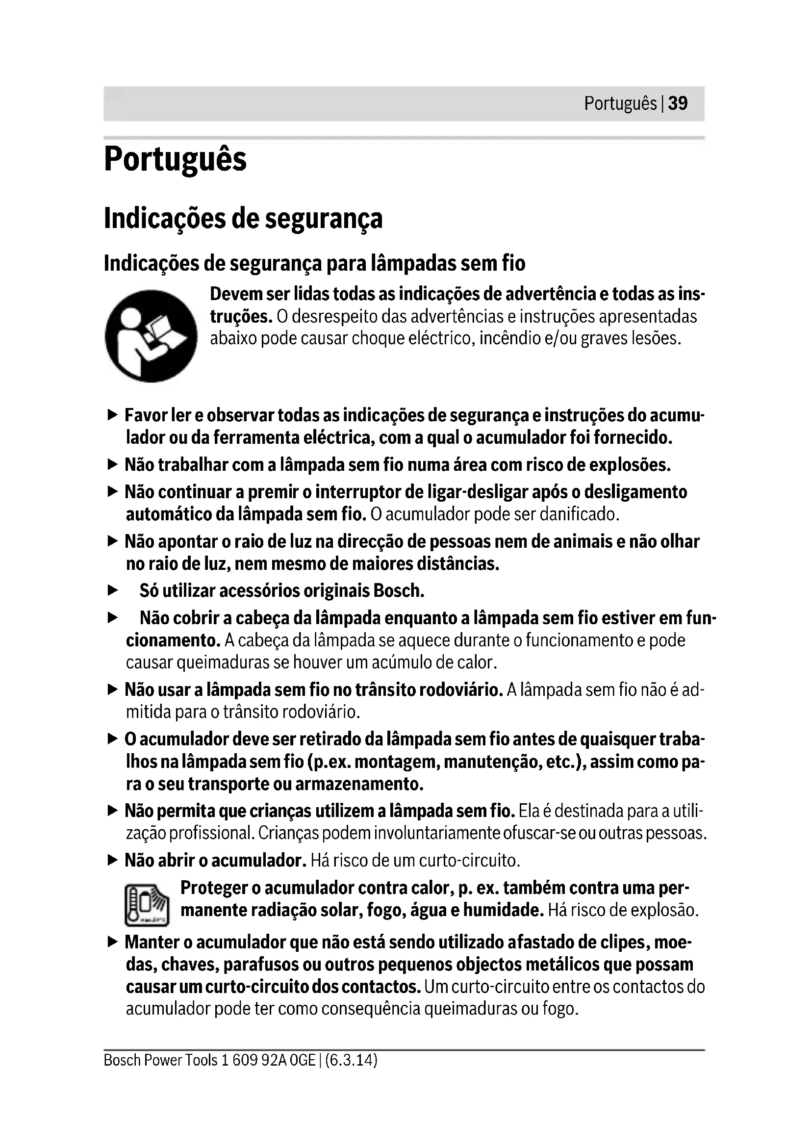 - potência limitada a temperaturas <0 °C OBJ_BUCH-2104-002.book Page 41 Thursday, March 6, 2014 1:22 PM42 | Português 1 609 92A 0GE | (6.3.14) Bosch Power Tools Montagem Carregar o acumulador (acessório) Só utilizar os carregadores que constam na página de acessórios. Só estes car- regadores são apropriados para a sua lâmpada sem fio para a seu acumulador de iões lítio. Nota: O acumulador é fornecido parcialmente carregado. Para assegurar a completa potência do acumulador, o acumulador deverá ser carregado completamente no car- regador antes da primeira utilização. O acumulador de iões de lítio pode ser carregado a qualquer altura, sem que a sua vi- da útil seja reduzida. Uma interrupção do processo de carga não danifica o acumula- dor. A “Electronic Cell Protection (ECP)” protege o acumulador de iões de lítio contra des- carga total. A lâmpada sem fio é desligada através de um disjuntor de protecção, logo que o acumulador estiver descarregado. Não continuar a premir o interruptor de ligar-desligar após o desligamento automático da da lâmpada sem fio. O acumulador pode ser danificado. Para retirar o acumulador 2 é necessário premir a tecla de destravamento 3 e puxar o acumulador para fora da lanterna sem fio. Não empregar força. Observar a indicação sobre a eliminação de forma ecológica. Funcionamento Colocação em funcionamento Colocar o acumulador Coloque o acumulador carregado 2 na cabeça da lanterna 1 até ele encaixar de forma perceptível. Ligar e desligar Para ligar a lâmpada sem fio, premir o interruptor de ligar-desligar 9. Para desligar a lâmpada sem fio, deverá premir o interruptor de ligar-desligar 9. Para poupar energia só deverá ligar a lâmpada sem fio quando ela for utilizada. Ajustar a claridade Pressione brevemente o interruptor ligar-desligar 9 para ligar a lanterna sem fio com a luminosidade máxima. Para adaptar a luminosidade em 2 níveis, mantenha premido o interruptor ligar-desligar 9 até alcançar a luminosidade desejada. OBJ_BUCH-2104-002.book Page 42 Thursday, March 6, 2014 1:22 PMPortuguês | 43 Bosch Power Tools 1 609 92A 0GE | (6.3.14) Protecção contra sobrecarga em dependência da temperatura Ao ultrapassar a temperatura admissível do dissipador de calor 50 °C, a lâmpada sem fio é desligada. Permitir que a lâmpada sem fio esfrie e ligue novamente a lâmpada sem fio. Indicações de trabalho A lanterna sem fio ilumina com luminosidade reduzida, se a capacidade do acumula- dor ainda for de aprox. 1,3 %. A lanterna sem fio pisca 3 vezes antes de reduzir a lu- minosidade. Oscilar a cabeça da lanterna (veja figura A) Consoante a utilização, a cabeça da lanterna 1 pode oscilar até 200°. – Como luminária com a cabeça da lanterna virada para cima. – Oscilada em 90° iluminando a divisão. – Com a cabeça da lanterna inclinada aprox. 120° sem encandear para iluminar o lo- cal de trabalho, p. ex. a secretária. – Com a cabeça da lanterna inclinada aprox. 200° para iluminar o chão. Nota: Numa inclinação superior a 90° a lanterna sem fio tem de ser fixada. Gancho para pendurar (veja figura B) Com o gancho de suspensão 7 pode fixar a lanterna sem fio a um objecto. Mosquetão (veja figura C) Com o mosquetão 4 pode fixar a lanterna sem fio p. ex. a uma corda ou cinto. Íman de fixação (veja figura D) Com o íman de fixação 6 pode aplicar a lanterna sem fio em superfícies ferromagné- ticas. Proceda com cuidado para não riscar superfícies sensíveis. Encaixe do tripé (1/4") (veja figura E) Com o encaixe do tripé 8 pode aparafusar a lanterna sem fio num tripé. Manutenção e serviço Manutenção e limpeza O acumulador não funciona mais; dirija-se a um serviço pós-venda autorizado para ferramentas eléctricas Bosch. A lâmpada sem fio não requer manutenção e nenhuma das suas peças necessita de manutenção ou precisa ser substituída. Para evitar danos, o vidro de plástico da lâmpada sem fio só deve ser limpo com um pano macio e seco. Não utilizar detergentes nem solventes. OBJ_BUCH-2104-002.book Page 43 Thursday, March 6, 2014 1:22 PM44 | Português 1 609 92A 0GE | (6.3.14) Bosch Power Tools Serviço pós-venda e consultoria de aplicação O serviço pós-venda responde às suas perguntas a respeito de serviços de reparação e de manutenção do seu produto, assim como das peças sobressalentes. Desenhos explodidos e informações sobre peças sobressalentes encontram-se em: www.bosch-pt.com A nossa equipa de consultoria de aplicação Bosch esclarecem com prazer todas as su- as dúvidas a respeito da compra, aplicação e ajuste dos produtos e acessórios. Para todas as questões e encomendas de peças sobressalentas é imprescindível indi- car o número de produto de 10 dígitos como consta na placa de características da lâmpada sem fio. Portugal Robert Bosch LDA Avenida Infante D. Henrique Lotes 2E – 3E 1800 Lisboa Para efectuar o seu pedido online de peças entre na página www.ferramentasbos- ch.com. Tel.: 21 8500000 Fax: 21 8511096 Brasil Robert Bosch Ltda. Caixa postal 1195 13065-900 Campinas Tel.: (0800) 7045446 www.bosch.com.br/contacto Transporte Os acumuladores de iões de lítio, contidos, estão sujeitos ao direito de materiais pe- rigosos. Os acumuladores podem ser transportados na rua pelo utilizador, sem mais obrigações. Na expedição por terceiros (por ex.: transporte aéreo ou expedição), devem ser ob- servadas as especiais exigências quanto à embalagem e à designação. Neste caso é necessário consultar um especialista de materiais perigosos ao preparar a peça a ser trabalhada. Só enviar acumuladores se a carcaça não estiver danificada. Colar contactos abertos e embalar o acumulador de modo que não possa se movimentar dentro da embala- gem. Por favor observe também eventuais directivas nacionais suplementares. OBJ_BUCH-2104-002.book Page 44 Thursday, March 6, 2014 1:22 PMItaliano | 45 Bosch Power Tools 1 609 92A 0GE | (6.3.14