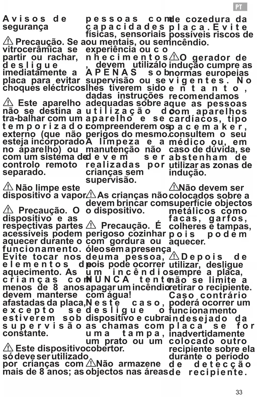 A v i s o s d e segurança Precaução. Se a vitrocerâmica se partir ou rachar, d e s l i g u e imediatamente a placa para evitar choques eléctricos. Este aparelho não se destina a tra-balhar com um t e m p o r i z a d o r externo (que não esteja incorporado no aparelho) ou com um sistema de controlo remoto separado. Não limpe este dispositivo a vapor. Precaução. O dispositivo e as respectivas partes acessíveis podem aquecer durante o funcionamento. Evite tocar nos e l e m e n t o s d e aquecimento. As c r i a n ç a s c o m menos de 8 anos devem manterse afastadas da placa, e x c e p t o s e esti verem sob s u p e r v i s ã o constante. Este dispositivo só deve ser utilizado por crianças com mais de 8 anos; as p e s s o a s c o m c a p a c i d a d e s físicas, sensoriais ou mentais, ou sem experiência ou c o n h e c i m e n t o s GHYHP XWLOL]iOR A P E N A S s o b supervisão ou se lhes tiverem sido dadas instruções adequadas sobre a u t i l i z a ç ã o d o apa relho e se compreenderem os perigos do mesmo. A limpeza e a manutenção não d e v e m s e r realizadas por crianças sem supervisão. As crianças não devem brincar com o dispositivo. Precaução. É perigoso cozinhar com gordura ou óleo sem a presença deuma pessoa, pois pode ocorrer u m i n c ê n d i o . N U N C A t e n t e apagar um incêndio FRPiJXD N e s t e c a s o , d e s l i g u e o dispositivo e cubra as chamas com u m a t a m p a , um prato ou um cobertor. Não armazene REMHFWRVQDViUHDV de cozedura da p l a c a . E v i t e possíveis riscos de incêndio. O gerador de indução cumpre as normas europeias v i g e n t e s . N o e n t a n t o , recomendamos que as pessoas com aparelhos cardíacos, tipo p a c e m a k e r , consultem o seu médico ou, em caso de dúvida, se ab ste nha m d e utilizar as zonas de indução. Não devem ser colocados sobre a superfície objectos PHWiOLFRV FRPR fa cas , g ar fos , colheres e tampas, p o i s p o d e m aquecer. D e p o i s d e utilizar, desligue sempre a placa, não se limite a retirar o recipiente. &DVR FRQWUiULR SRGHUiRFRUUHUXP funcionamento indesejado da p l a c a s e f o r inadvertidamente colocado outro recipiente sobre ela durante o período d e d e t e c ç ã o de r eci pie nte .PT