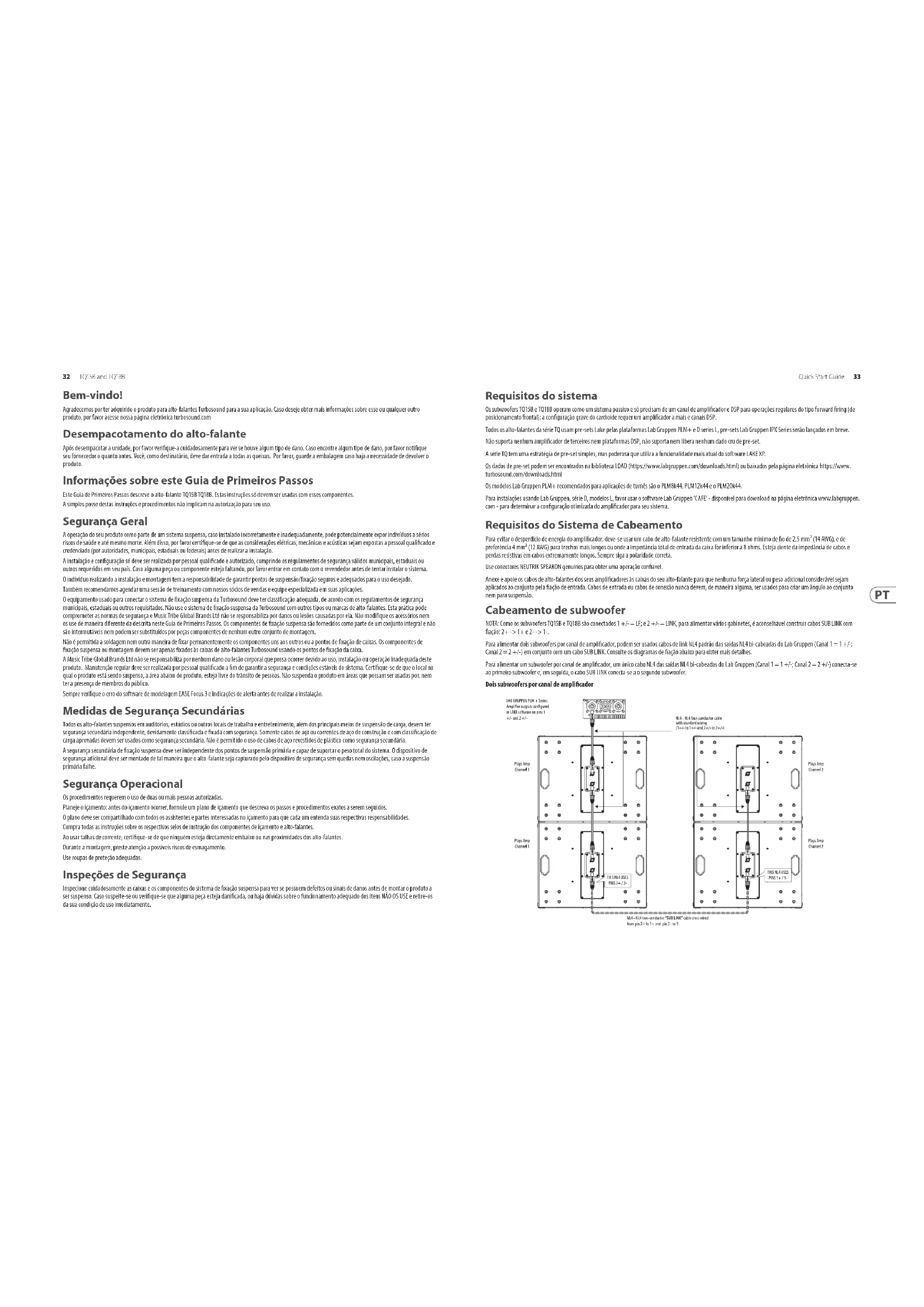 Front Input SUB + Not Connected Not Connected Front Input SUB - Rigging und Akustiksimulationssoftware Der TQ15B TQ18B-Lautsprecher ist kein arrayfähiges Produkt. Er wird in Ease Focus 3, ein Akustiksimulationsprogramm, das als kostenloser Download auf https:// www.afmg.eu/en/ease-focus verfügbar ist.30 TQ15B and TQ18B Quick Start Guide 31 Installation Sicherheitswarnung: Nur autorisiertes und zertiziertes Personal darf hängende Kongurationen entwerfen und installieren. Eine unsachgemäße Installation kann zum Tod oder zu dauerhaften Verletzungen führen. Die Verwendung eines sekundären Sicherheitskabels ist eine zwingende Sicherheitsanforderung bei der Installation dieses Produkts mit den M10- Montagepunkten. Der vielseitige TQ-Lautsprecher verfügt über Füße an der Unterseite zum Aufstellen des Lautsprechers auf einer ebenen Fläche, zwei integrierte Önungen für die Stangenmontage und M10-Montageönungen mit passenden Innensechskantschrauben. Pole Mount Feet Groundstacking Der TQ15B/TQ18B kann in horizontaler oder vertikaler Ausrichtung auf dem Boden gestapelt werden. Versuchen Sie bei vertikaler Ausrichtung, zwei davon in der gezeigten Ausrichtung zu montieren. Als zusätzliche Sicherheitsmaßnahme empehlt es sich, geeignete Schlägergurte um die Schrankgruppe zu schlingen. Badge-Drehung Das Turbosound-Badge ist federgelagert und kann von Hand gedreht werden, um es vertikal oder horizontal anzubringen. Aufhängepunkten Die TQ15B TQ18B subwoofers sind mit mehreren internen Aufhängepunkten ausgestattet, um eine Vielzahl von Befestigungsmöglichkeiten bei Festinstallationen zu ermöglichen. Alle Gehäuse können einfach mit optionalen M10-Schulterösen aufgehängt werden, die mit den vorgesehenen internen Aufhängepunkten verbunden werden. Entfernen Sie die entsprechenden Senkkopfschrauben und ersetzen Sie sie durch Ringschrauben, die eine Gewindelänge von mindestens 40 mm haben müssen. Die Gehäuse können bei Bedarf auch kopfüber aufgehängt werden. Rigging Points Eyebolts M10 Shoulder Eyebolt 40 mm Stangenmontage Zwei 35 mm-Önungen sind für die Stangenmontage vorgesehen. Wir empfehlen die Verwendung einer 35 mm-Stange mit einem M20-Gewinde am unteren Ende. Dieser Typ bietet mehr Sicherheit und wird in die obere Fassung des Subwoofers geschraubt.. Transporträder (Option) Ein optionaler Bausatz ermöglicht die Montage von vier Rädern wie abgebildet. Lake Preset Overlays und Anwendungshinweise Alle Lautsprecher der TQ-Serie verwenden ausschließlich Lake XP Presets via Lab Gruppen PLM+ und D-Serie L-Plattformen sowie die in Kürze erscheinenden IPX FiR-X Presets. Andere Verstärker- und DSP-Plattformen werden nicht unterstützt. Die TQ-Serie verfügt über eine leistungsstarke und dennoch einfache Preset-Strategie, die die neuesten Funktionen der Lake-Software zusammen mit neuen BLEQ- Overlays nutzt. Preset-Daten sind entweder in der Lake Load Library zu nden oder können von www.turbosound.com heruntergeladen werden. TQ15B und TQ18B Subwoofer verfügen jeweils über individuelle passive 1-Weg FIR-Base-Presets (1 Kanal DSP/AMP). VORSICHT: Kombinieren Sie keine TQ15B und TQ18B Subwoofer an der gleichen Verstärker/DSP-Schaltung. Die Nichtbeachtung dieser Anweisungen kann zu Schäden an den Geräten führen. VORSICHT: Achten Sie sorgfältig auf das Ausgangspatching. Die Module TQ15B und TQ18B basieren auf dem XP-Modul von Lake Software. Diese Schnellstartanleitung bezieht sich auf REV1.1 XP Presets. Es muss die Lake Software V7.0.7 oder höher verwendet werden. Lake XP Signaluss: Der Download des Lake Controllers beinhaltet das Lake Controller Operation Manual, das ein vollständiges Tutorial für den Lake Controller und kompatible Hardware wie die Verstärker der PLM+ Serie enthält. In dieser Schnellstartanleitung konzentrieren wir uns auf den Workow und die Preset-Strategie der Turbosound TQ-Serie und setzen grundlegende Kenntnisse über den Lake Controller voraus.32 TQ15B and TQ18B Quick Start Guide 33 Bem-vindo! Agradecemos por ter adquirido o produto para alto-falantes Turbosound para a sua aplicação. Caso deseje obter mais informações sobre esse ou qualquer outro produto, por favor acesse nossa página eletrônica turbosound.com Desempacotamento do alto-falante Após desempacotar a unidade, por favor verique-a cuidadosamente para ver se houve algum tipo de dano. Caso encontre algum tipo de dano, por favor notique seu fornecedor o quanto antes. Você, como destinatário, deve dar entrada a todas as queixas. Por favor, guarde a embalagem caso haja a necessidade de devolver o produto. Informações sobre este Guia de Primeiros Passos Este Guia de Primeiros Passos descreve o alto-falante TQ15B TQ18B. Estas instruções só devem ser usadas com esses componentes. A simples posse destas instruções e procedimentos não implicam na autorização para seu uso. Segurança Geral A operação do seu produto como parte de um sistema suspenso, caso instalado incorretamente e inadequadamente, pode potencialmente expor indivíduos a sérios riscos de saúde e até mesmo morte. Além disso, por favor certique-se de que as considerações elétricas, mecânicas e acústicas sejam expostas a pessoal qualicado e credenciado (por autoridades, municipais, estaduais ou federais) antes de realizar a instalação. A instalação e conguração só deve ser realizada por pessoal qualicado e autorizado, cumprindo os regulamentos de segurança válidos municipais, estaduais ou outros requeridos em seu país. Caso alguma peça ou componente esteja faltando, por favor entrar em contato com o revendedor antes de tentar instalar o sistema. O indivíduo realizando a instalação e montagem tem a responsabilidade de garantir pontos de suspensão/xação seguros e adequados para o uso desejado. Também recomendamos agendar uma sessão de treinamento com nossos sócios de vendas e equipe especializada em suas aplicações. O equipamento usado para conectar o sistema de xação suspensa da Turbo