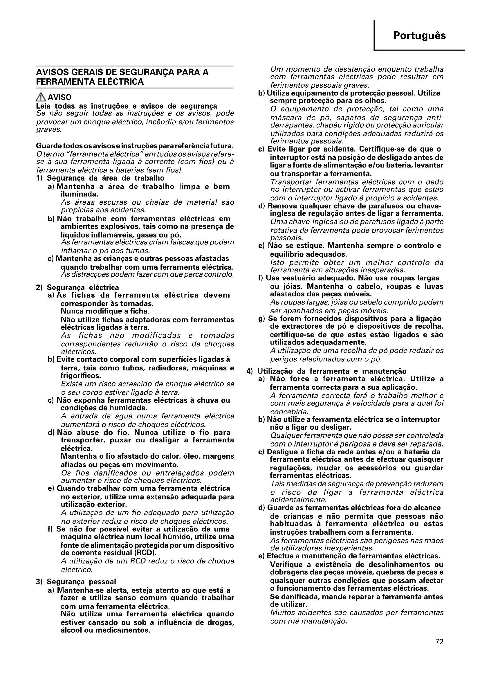 AVISO Leia todas as instruções e avisos de segurança Se não seguir todas as instruções e os avisos, pode provocar um choque eléctrico, incêndio e/ou ferimentos graves. Guarde todos os avisos e instruções para referência futura. O termo “ferramenta eléctrica” em todos os avisos refere- se à sua ferramenta ligada à corrente (com fios) ou à ferramenta eléctrica a baterias (sem fios).