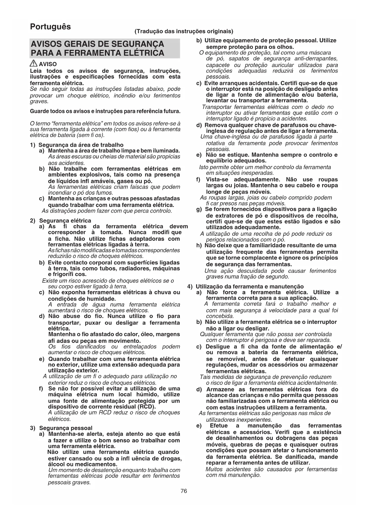 a) Mantenha-se alerta, esteja atento ao que está a fazer e utilize o bom senso ao trabalhar com uma ferramenta elétrica. Não utilize uma ferramenta elétrica quando estiver cansado ou sob a infl uência de drogas, álcool ou medicamentos. Um momento de desatenção enquanto trabalha com ferramentas elétricas pode resultar em ferimentos pessoais graves. (Tradução das instruções originais) 0000BookWHP18DBL.indb760000BookWHP18DBL.indb76 2020/08/2514:36:562020/08/2514:36:5677 Português f) Mantenha as ferramentas de corte afi adas e limpas. As ferramentas de corte com uma manutenção adequada e extremidades afi adas são menos propensas a dobrar e mais fáceis de controlar.