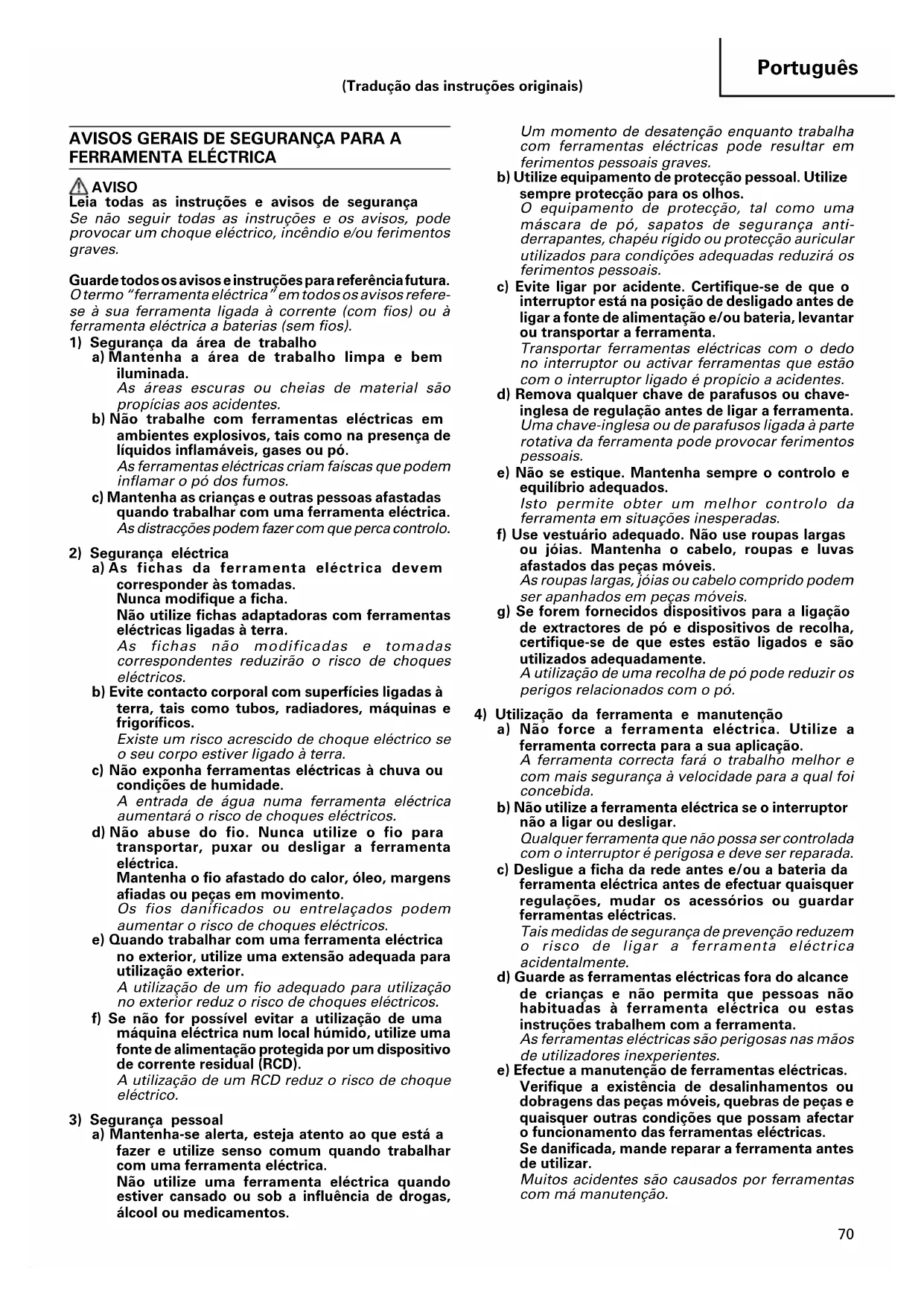 AVISO Leia todas as instruções e avisos de segurança Se não seguir todas as instruções e os avisos, pode provocar um choque eléctrico, incêndio e/ou ferimentos graves. Guarde todos os avisos e instruções para referência futura. O termo “ferramenta eléctrica” em todos os avisos refere- se à sua ferramenta ligada à corrente (com fios) ou à ferramenta eléctrica a baterias (sem fios).