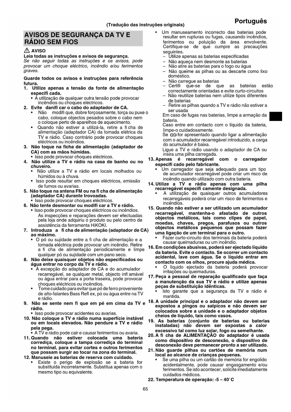 auscultadores ou auriculares. Ouvir a TV e rádio durante um longo período de tempo a um volume alto pode resultar em difi culdades de audição. PRECAUÇÕES A TER AO LIGAR A EQUIPAMENTO EXTERNO Problemas inesperados podem resultar na perda ou corrupção de dados armazenados em smartphones e outros equipamentos periféricos conectados à TV e rádio. Tendo isso em mente, deve ser efectuada previamente uma cópia de segurança dos dados. Note-se que a HiKOKI não pode ser responsabilizada pela corrupção ou perda de dados armazenados dentro de smartphones e outros equipamentos periféricos conectados à TV e rádio, nem qualquer dano para o próprio equipamento.