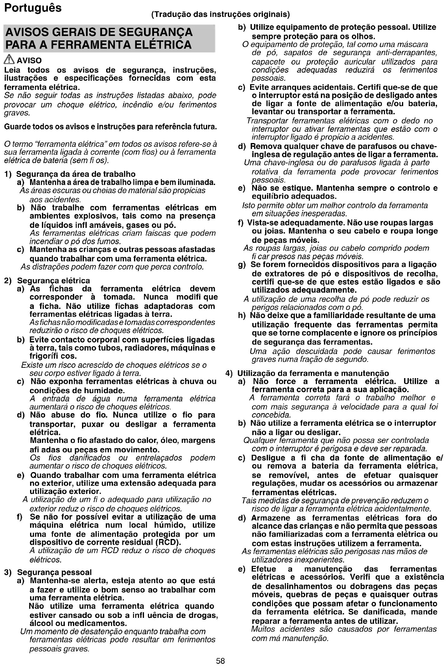 a) Mantenha-se alerta, esteja atento ao que está a fazer e utilize o bom senso ao trabalhar com uma ferramenta elétrica. Não utilize uma ferramenta elétrica quando estiver cansado ou sob a infl uência de drogas, álcool ou medicamentos. Um momento de desatenção enquanto trabalha com ferramentas elétricas pode resultar em ferimentos pessoais graves. (Tradução das instruções originais) 0000BookNH18DSLEU.indb580000BookNH18DSLEU.indb58 2021/02/1213:50:332021/02/1213:50:3359 Português f) Mantenha as ferramentas de corte afi adas e limpas. As ferramentas de corte com uma manutenção adequada e extremidades afi adas são menos propensas a dobrar e mais fáceis de controlar. g) Utilize a ferramenta elétrica, acessórios e brocas de ferramentas, etc., de acordo com estas instruções, tendo em consideração as condições de trabalho e o trabalho a ser efetuado. A utilização de uma ferramenta elétrica para operações diferentes das previstas pode resultar numa situação perigosa. h) Mantenha as pegas e as superfícies de manuseamento secas, limpas e livres de óleo e graxa. Pegas de manuseamento escorregadias não permitem a manipulação segura e controlo da ferramenta em situações inesperadas.